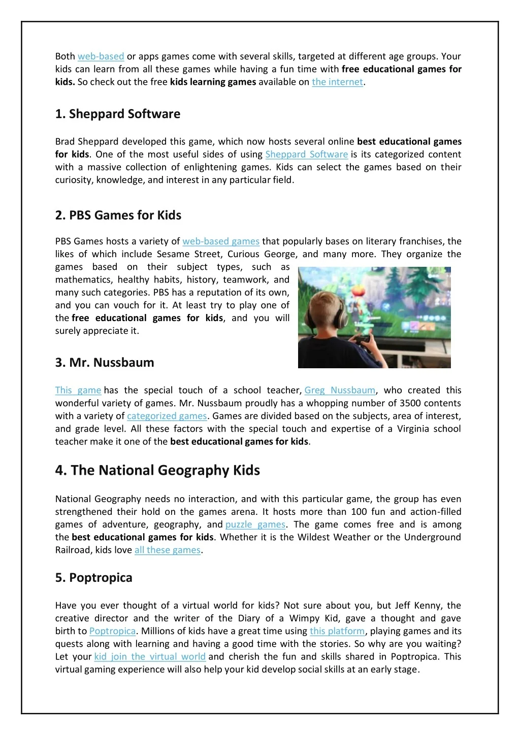 Both web-based or apps games come with several skills, targeted at different age groups. Your kids can learn from all these games while having a fun time with free educational games for kids. So check out the free kids learning games available on the internet. 1. Sheppard Software Brad Sheppard developed this game, which now hosts several online best educational games for kids. One of the most useful sides of using Sheppard Software is its categorized content with a massive collection of enlightening games. Kids can select the games based on their curiosity, knowledge, and interest in any particular field. 2. PBS Games for Kids PBS Games hosts a variety of web-based games that popularly bases on literary franchises, the likes of which include Sesame Street, Curious George, and many more. They organize the games based on their subject types, such as mathematics, healthy habits, history, teamwork, and many such categories. PBS has a reputation of its own, and you can vouch for it. At least try to play one of the free educational games for kids, and you will surely appreciate it. 3. Mr. Nussbaum This game has the special touch of a school teacher, Greg Nussbaum, who created this wonderful variety of games. Mr. Nussbaum proudly has a whopping number of 3500 contents with a variety of categorized games. Games are divided based on the subjects, area of interest, and grade level. All these factors with the special touch and expertise of a Virginia school teacher make it one of the best educational games for kids. 4. The National Geography Kids National Geography needs no interaction, and with this particular game, the group has even strengthened their hold on the games arena. It hosts more than 100 fun and action-filled games of adventure, geography, and puzzle games. The game comes free and is among the best educational games for kids. Whether it is the Wildest Weather or the Underground Railroad, kids love all these games. 5. Poptropica Have you ever thought of a virtual world for kids? Not sure about you, but Jeff Kenny, the creative director and the writer of the Diary of a Wimpy Kid, gave a thought and gave birth to Poptropica. Millions of kids have a great time using this platform, playing games and its quests along with learning and having a good time with the stories. So why are you waiting? Let your kid join the virtual world and cherish the fun and skills shared in Poptropica. This virtual gaming experience will also help your kid develop social skills at an early stage.