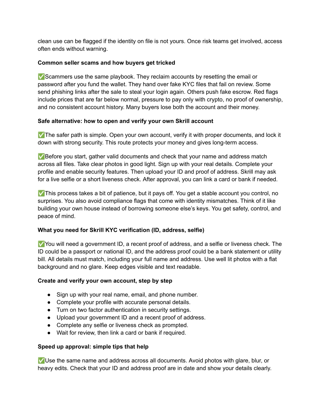 3. clean use can be flagged if the identity on file is not yours. Once risk teams get involved, access often ends without warning. Common seller scams and how buyers get tricked ✅Scammers use the same playbook. They reclaim accounts by resetting the email or password after you fund the wallet. They hand over fake KYC files that fail on review. Some send phishing links after the sale to steal your login again. Others push fake escrow. Red flags include prices that are far below normal, pressure to pay only with crypto, no proof of ownership, and no consistent account history. Many buyers lose both the account and their money. Safe alternative: how to open and verify your own Skrill account ✅The safer path is simple. Open your own account, verify it with proper documents, and lock it down with strong security. This route protects your money and gives long-term access. ✅Before you start, gather valid documents and check that your name and address match across all files. Take clear photos in good light. Sign up with your real details. Complete your profile and enable security features. Then upload your ID and proof of address. Skrill may ask for a live selfie or a short liveness check. After approval, you can link a card or bank if needed. ✅This process takes a bit of patience, but it pays off. You get a stable account you control, no surprises. You also avoid compliance flags that come with identity mismatches. Think of it like building your own house instead of borrowing someone else’s keys. You get safety, control, and peace of mind. What you need for Skrill KYC verification (ID, address, selfie) ✅You will need a government ID, a recent proof of address, and a selfie or liveness check. The ID could be a passport or national ID, and the address proof could be a bank statement or utility bill. All details must match, including your full name and address. Use well lit photos with a flat background and no glare. Keep edges visible and text readable. Create and verify your own account, step by step ● Sign up with your real name, email, and phone number. ● Complete your profile with accurate personal details. ● Turn on two factor authentication in security settings. ● Upload your government ID and a recent proof of address. ● Complete any selfie or liveness check as prompted. ● Wait for review, then link a card or bank if required. Speed up approval: simple tips that help ✅Use the same name and address across all documents. Avoid photos with glare, blur, or heavy edits. Check that your ID and address proof are in date and show your details clearly.
