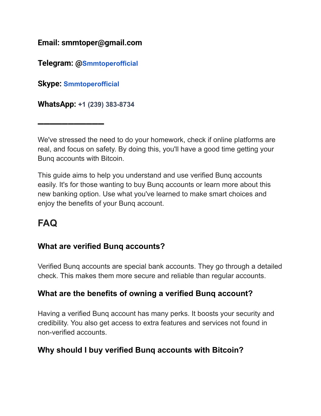 Email: smmtoper@gmail.com Telegram: @Smmtoperofficial Skype: Smmtoperofficial WhatsApp: +1 (239) 383-8734 ▬▬▬▬▬▬▬▬▬▬▬ We've stressed the need to do your homework, check if online platforms are real, and focus on safety. By doing this, you'll have a good time getting your Bunq accounts with Bitcoin. This guide aims to help you understand and use verified Bunq accounts easily. It's for those wanting to buy Bunq accounts or learn more about this new banking option. Use what you've learned to make smart choices and enjoy the benefits of your Bunq account. FAQ What are verified Bunq accounts? Verified Bunq accounts are special bank accounts. They go through a detailed check. This makes them more secure and reliable than regular accounts. What are the benefits of owning a verified Bunq account? Having a verified Bunq account has many perks. It boosts your security and credibility. You also get access to extra features and services not found in non-verified accounts. Why should I buy verified Bunq accounts with Bitcoin?