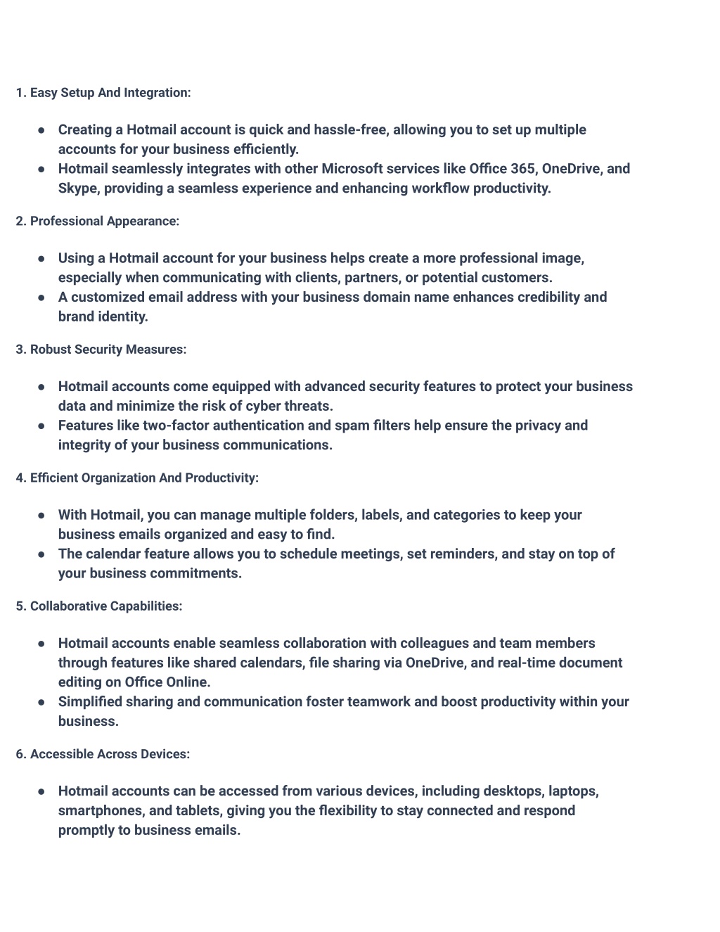 1. Easy Setup And Integration: ● Creating a Hotmail account is quick and hassle-free, allowing you to set up multiple accounts for your business efficiently. ● Hotmail seamlessly integrates with other Microsoft services like Office 365, OneDrive, and Skype, providing a seamless experience and enhancing workflow productivity. 2. Professional Appearance: ● Using a Hotmail account for your business helps create a more professional image, especially when communicating with clients, partners, or potential customers. ● A customized email address with your business domain name enhances credibility and brand identity. 3. Robust Security Measures: ● Hotmail accounts come equipped with advanced security features to protect your business data and minimize the risk of cyber threats. ● Features like two-factor authentication and spam filters help ensure the privacy and integrity of your business communications. 4. Efficient Organization And Productivity: ● With Hotmail, you can manage multiple folders, labels, and categories to keep your business emails organized and easy to find. ● The calendar feature allows you to schedule meetings, set reminders, and stay on top of your business commitments. 5. Collaborative Capabilities: ● Hotmail accounts enable seamless collaboration with colleagues and team members through features like shared calendars, file sharing via OneDrive, and real-time document editing on Office Online. ● Simplified sharing and communication foster teamwork and boost productivity within your business. 6. Accessible Across Devices: ● Hotmail accounts can be accessed from various devices, including desktops, laptops, smartphones, and tablets, giving you the flexibility to stay connected and respond promptly to business emails.