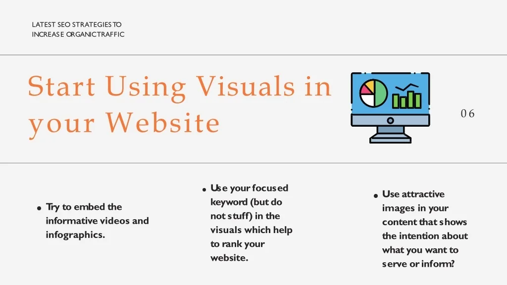 LATESTSEOSTRATEGIESTO INCREASEORGANICTRAFFIC StartUsingVisualsin yourWebsite 06 Useyourfocused keyword(butdo notstuff)inthe visualswhichhelp torankyour website. Use attractive images in your contentthatshows theintentionabout what you want to serveorinform? Trytoembedthe informativevideosand infographics.