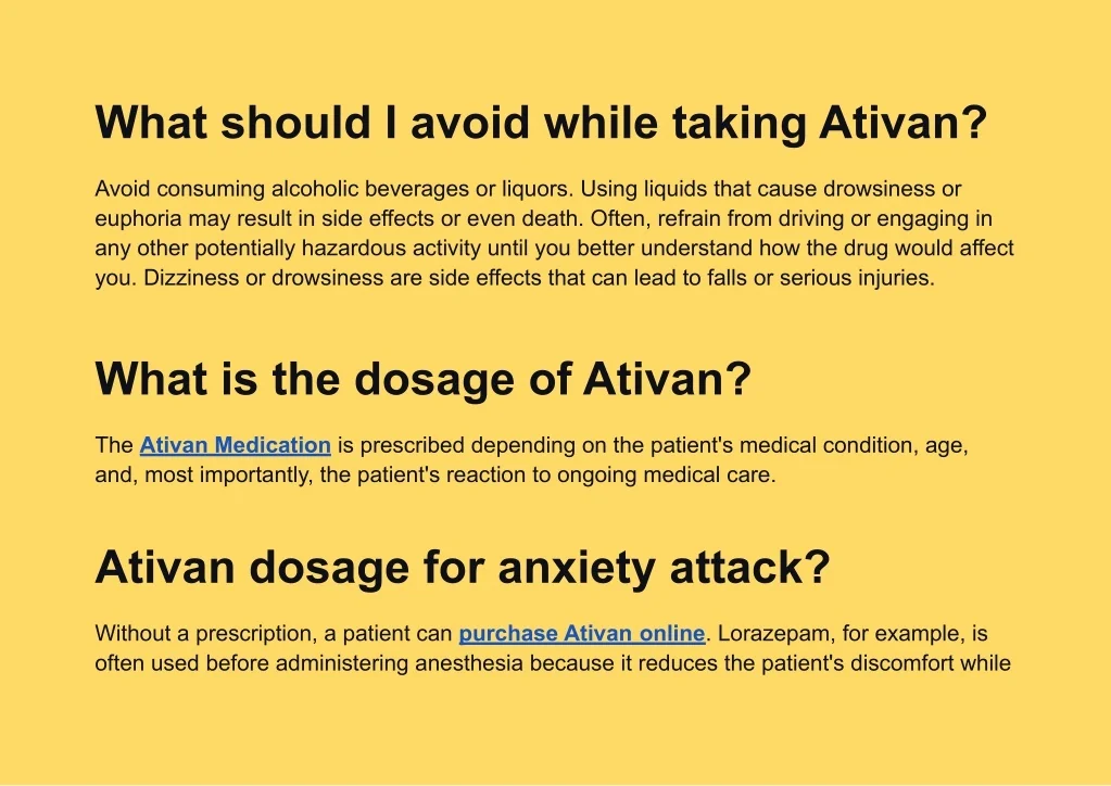 What should I avoid while taking Ativan? Avoid consuming alcoholic beverages or liquors. Using liquids that cause drowsiness or euphoria may result in side effects or even death. Often, refrain from driving or engaging in any other potentially hazardous activity until you better understand how the drug would affect you. Dizziness or drowsiness are side effects that can lead to falls or serious injuries. What is the dosage of Ativan? The Ativan Medication is prescribed depending on the patient's medical condition, age, and, most importantly, the patient's reaction to ongoing medical care. Ativan dosage for anxiety attack? Without a prescription, a patient can purchase Ativan online. Lorazepam, for example, is often used before administering anesthesia because it reduces the patient's discomfort while