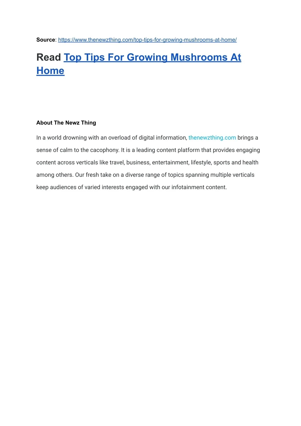 Source: https://www.thenewzthing.com/top-tips-for-growing-mushrooms-at-home/ Read Top Tips For Growing Mushrooms At Home About The Newz Thing In a world drowning with an overload of digital information, thenewzthing.com brings a sense of calm to the cacophony. It is a leading content platform that provides engaging content across verticals like travel, business, entertainment, lifestyle, sports and health among others. Our fresh take on a diverse range of topics spanning multiple verticals keep audiences of varied interests engaged with our infotainment content.