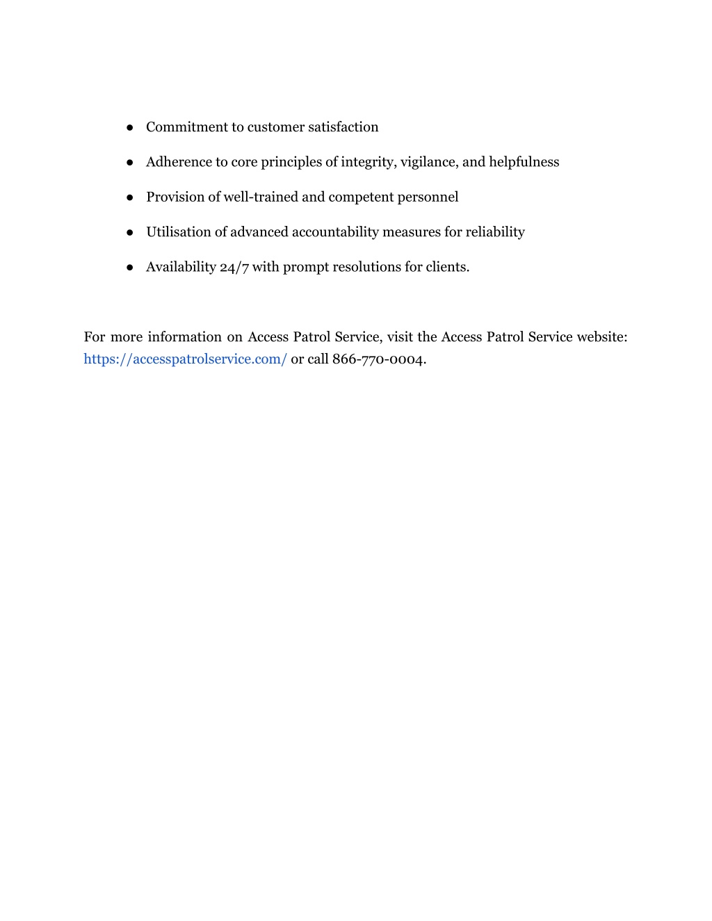 ●Commitment to customer satisfaction ●Adherence to core principles of integrity, vigilance, and helpfulness ●Provision of well-trained and competent personnel ●Utilisation of advanced accountability measures for reliability ●Availability 24/7 with prompt resolutions for clients. For more information on Access Patrol Service, visit the Access Patrol Service website: https://accesspatrolservice.com/ or call 866-770-0004.