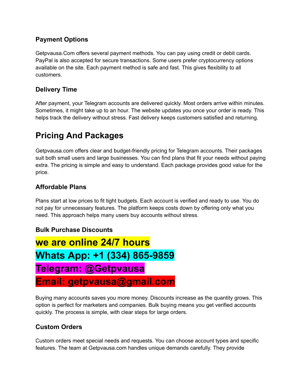Payment Options Getpvausa.Com offers several payment methods. You can pay using credit or debit cards. PayPal is also accepted for secure transactions. Some users prefer cryptocurrency options available on the site. Each payment method is safe and fast. This gives flexibility to all customers. Delivery Time After payment, your Telegram accounts are delivered quickly. Most orders arrive within minutes. Sometimes, it might take up to an hour. The website updates you once your order is ready. This helps track the delivery without stress. Fast delivery keeps customers satisfied and returning. Pricing And Packages Getpvausa.com offers clear and budget-friendly pricing for Telegram accounts. Their packages suit both small users and large businesses. You can find plans that fit your needs without paying extra. The pricing is simple and easy to understand. Each package provides good value for the price. Affordable Plans Plans start at low prices to fit tight budgets. Each account is verified and ready to use. You do not pay for unnecessary features. The platform keeps costs down by offering only what you need. This approach helps many users buy accounts without stress. Bulk Purchase Discounts we are online 24/7 hours Whats App: +1 (334) 865-9859 Telegram: @Getpvausa Email: getpvausa@gmail.com Buying many accounts saves you more money. Discounts increase as the quantity grows. This option is perfect for marketers and companies. Bulk buying means you get verified accounts quickly. The process is simple, with clear steps for large orders. Custom Orders Custom orders meet special needs and requests. You can choose account types and specific features. The team at Getpvausa.com handles unique demands carefully. They provide