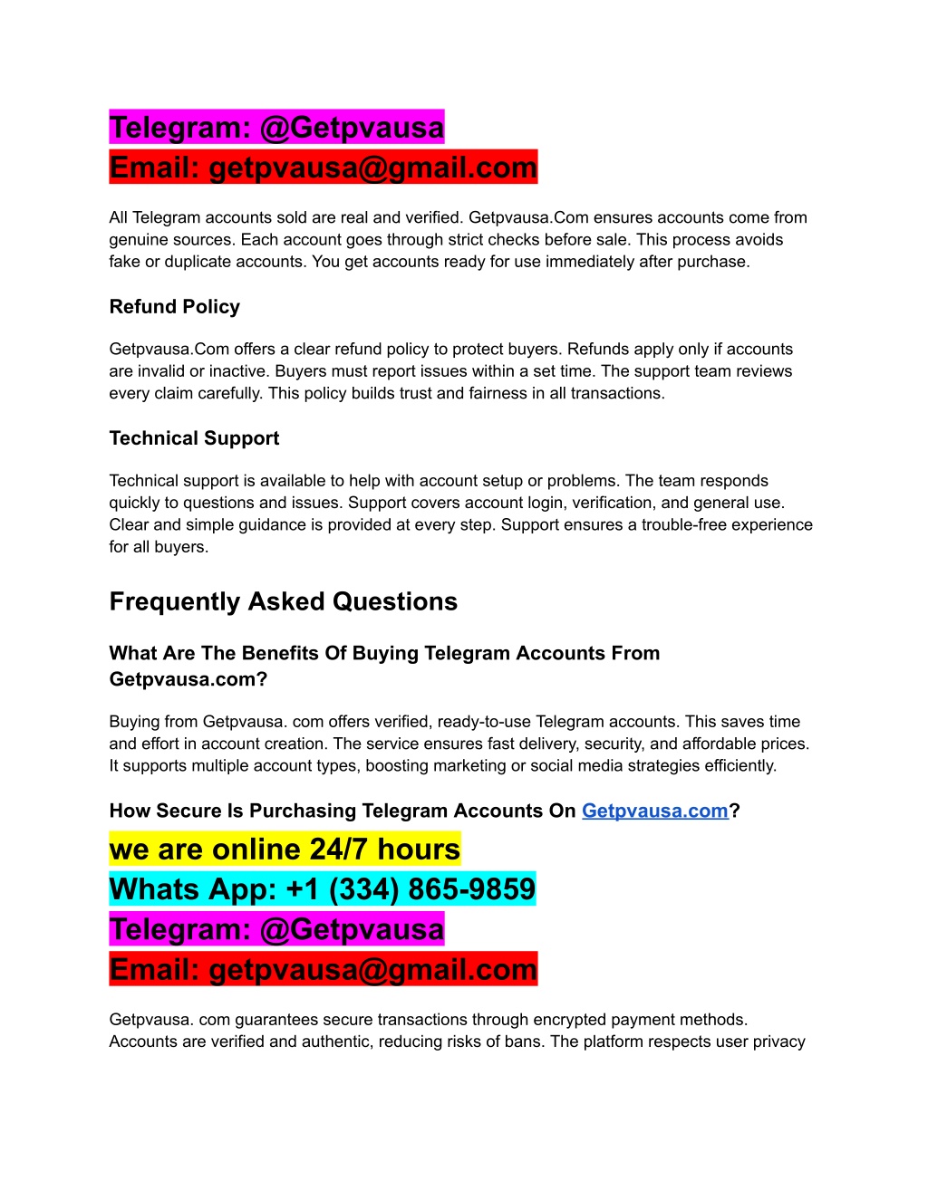 Telegram: @Getpvausa Email: getpvausa@gmail.com All Telegram accounts sold are real and verified. Getpvausa.Com ensures accounts come from genuine sources. Each account goes through strict checks before sale. This process avoids fake or duplicate accounts. You get accounts ready for use immediately after purchase. Refund Policy Getpvausa.Com offers a clear refund policy to protect buyers. Refunds apply only if accounts are invalid or inactive. Buyers must report issues within a set time. The support team reviews every claim carefully. This policy builds trust and fairness in all transactions. Technical Support Technical support is available to help with account setup or problems. The team responds quickly to questions and issues. Support covers account login, verification, and general use. Clear and simple guidance is provided at every step. Support ensures a trouble-free experience for all buyers. Frequently Asked Questions What Are The Benefits Of Buying Telegram Accounts From Getpvausa.com? Buying from Getpvausa. com offers verified, ready-to-use Telegram accounts. This saves time and effort in account creation. The service ensures fast delivery, security, and affordable prices. It supports multiple account types, boosting marketing or social media strategies efficiently. How Secure Is Purchasing Telegram Accounts On Getpvausa.com? we are online 24/7 hours Whats App: +1 (334) 865-9859 Telegram: @Getpvausa Email: getpvausa@gmail.com Getpvausa. com guarantees secure transactions through encrypted payment methods. Accounts are verified and authentic, reducing risks of bans. The platform respects user privacy