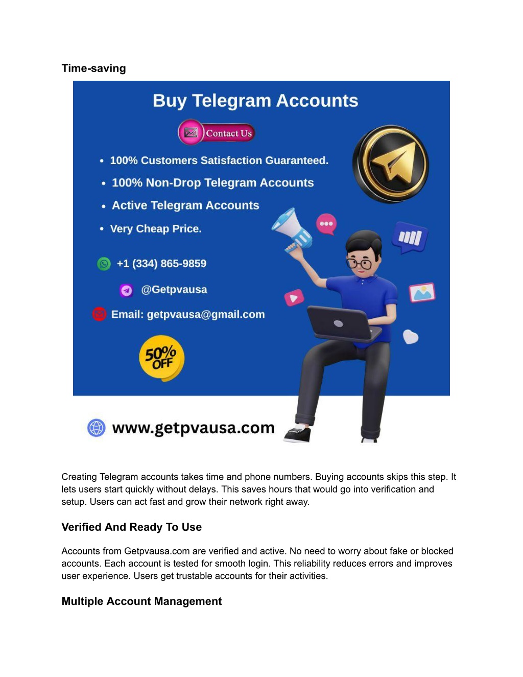 Imagine skipping the long wait and hassle of creating accounts yourself while gaining instant access to reliable, verified profiles. This simple step can save you time, increase your reach, and help you connect with your audience faster than ever. Keep reading to discover why Getpvausa. com is the trusted choice for so many and how it can work for you. Why Choose Getpvausa Choosing the right platform to buy Telegram accounts is important. Getpvausa.com stands out for many reasons. It offers trustworthy services that meet user needs. The site focuses on quality and customer satisfaction. Reputation And Reliability Getpvausa.com has built a strong reputation over time. Users trust the site for authentic and safe Telegram accounts. Each account is verified to ensure it works properly. The platform keeps user information secure. This makes buying accounts hassle-free and safe. Customer Support we are online 24/7 hours Whats App: +1 (334) 865-9859 Telegram: @Getpvausa Email: getpvausa@gmail.com Getpvausa.com offers helpful customer support. The team is ready to answer questions quickly. They provide clear guidance on buying and using accounts. Support is available through multiple channels for convenience. This helps users feel confident during their purchase. User Experience The website is easy to use and navigate. Finding and buying Telegram accounts is simple and fast. Clear instructions guide users through every step. The design works well on phones and computers. This smooth experience saves time and reduces stress. Benefits Of Buying Telegram Accounts Buying Telegram accounts from Getpvausa.com offers several benefits. It saves time and effort in creating new accounts. Accounts come ready for use, verified and secure. Managing multiple accounts becomes easy and efficient. These advantages help users focus on their main tasks.