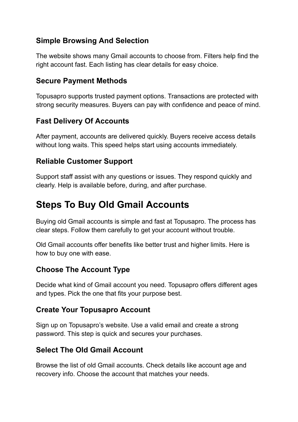 Simple Browsing And Selection The website shows many Gmail accounts to choose from. Filters help find the right account fast. Each listing has clear details for easy choice. Secure Payment Methods Topusapro supports trusted payment options. Transactions are protected with strong security measures. Buyers can pay with confidence and peace of mind. Fast Delivery Of Accounts After payment, accounts are delivered quickly. Buyers receive access details without long waits. This speed helps start using accounts immediately. Reliable Customer Support Support staff assist with any questions or issues. They respond quickly and clearly. Help is available before, during, and after purchase. Steps To Buy Old Gmail Accounts Buying old Gmail accounts is simple and fast at Topusapro. The process has clear steps. Follow them carefully to get your account without trouble. Old Gmail accounts offer benefits like better trust and higher limits. Here is how to buy one with ease. Choose The Account Type Decide what kind of Gmail account you need. Topusapro offers different ages and types. Pick the one that fits your purpose best. Create Your Topusapro Account Sign up on Topusapro’s website. Use a valid email and create a strong password. This step is quick and secures your purchases. Select The Old Gmail Account Browse the list of old Gmail accounts. Check details like account age and recovery info. Choose the account that matches your needs.