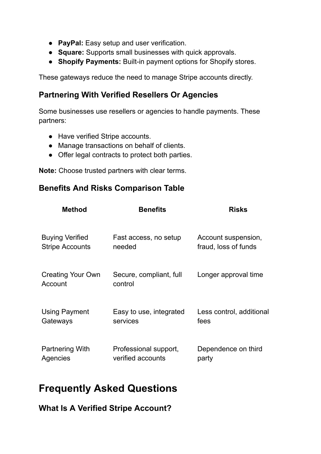 7. ● PayPal: Easy setup and user verification. ● Square: Supports small businesses with quick approvals. ● Shopify Payments: Built-in payment options for Shopify stores. These gateways reduce the need to manage Stripe accounts directly. Partnering With Verified Resellers Or Agencies Some businesses use resellers or agencies to handle payments. These partners: ● Have verified Stripe accounts. ● Manage transactions on behalf of clients. ● Offer legal contracts to protect both parties. Note: Choose trusted partners with clear terms. Benefits And Risks Comparison Table Method Benefits Risks Buying Verified Stripe Accounts Fast access, no setup needed Account suspension, fraud, loss of funds Creating Your Own Account Secure, compliant, full control Longer approval time Using Payment Gateways Easy to use, integrated services Less control, additional fees Partnering With Agencies Professional support, verified accounts Dependence on third party Frequently Asked Questions What Is A Verified Stripe Account?