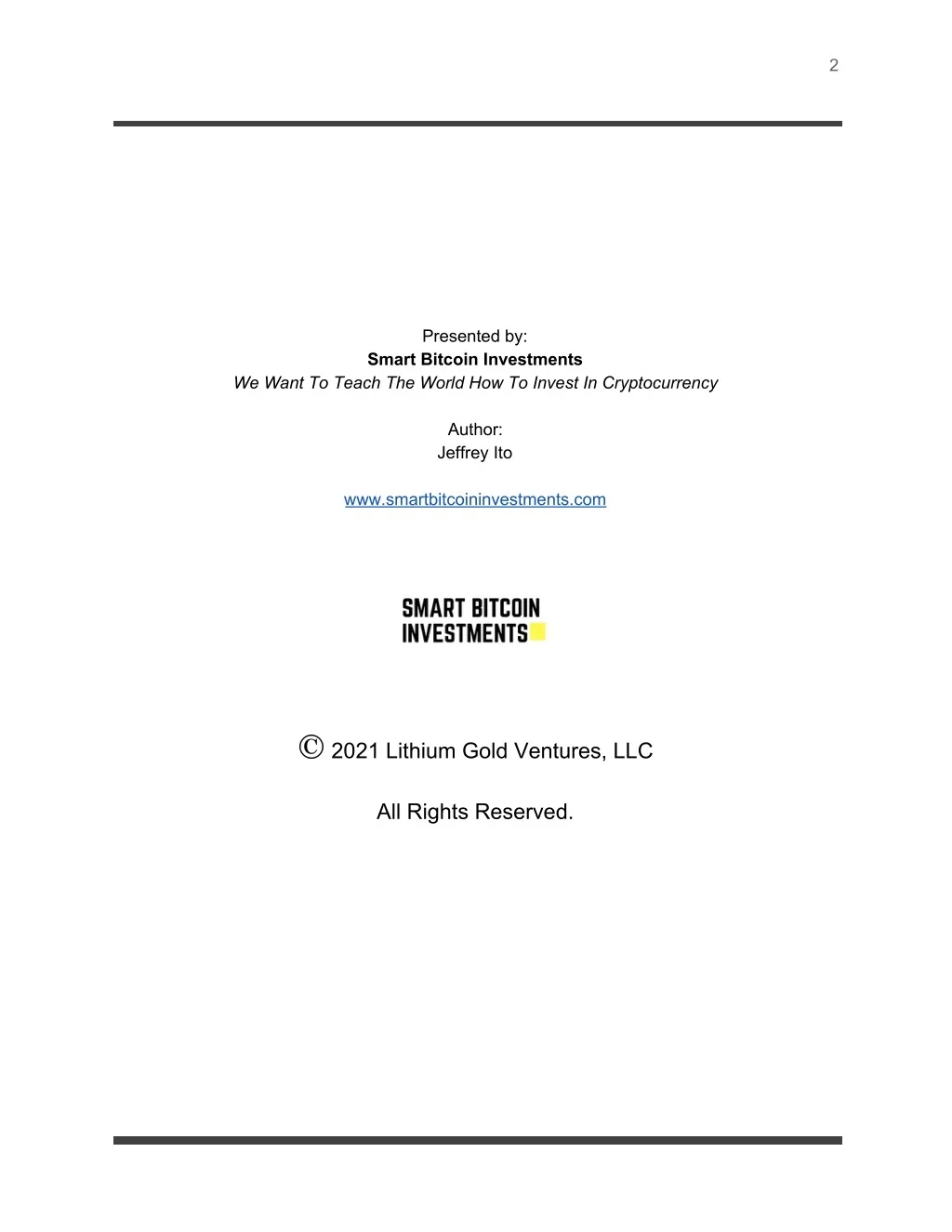 2 Presented by: Smart Bitcoin Investments We Want To Teach The World How To Invest In Cryptocurrency Author: Jeffrey Ito www.smartbitcoininvestments.com 2021 Lithium Gold Ventures, LLC All Rights Reserved.