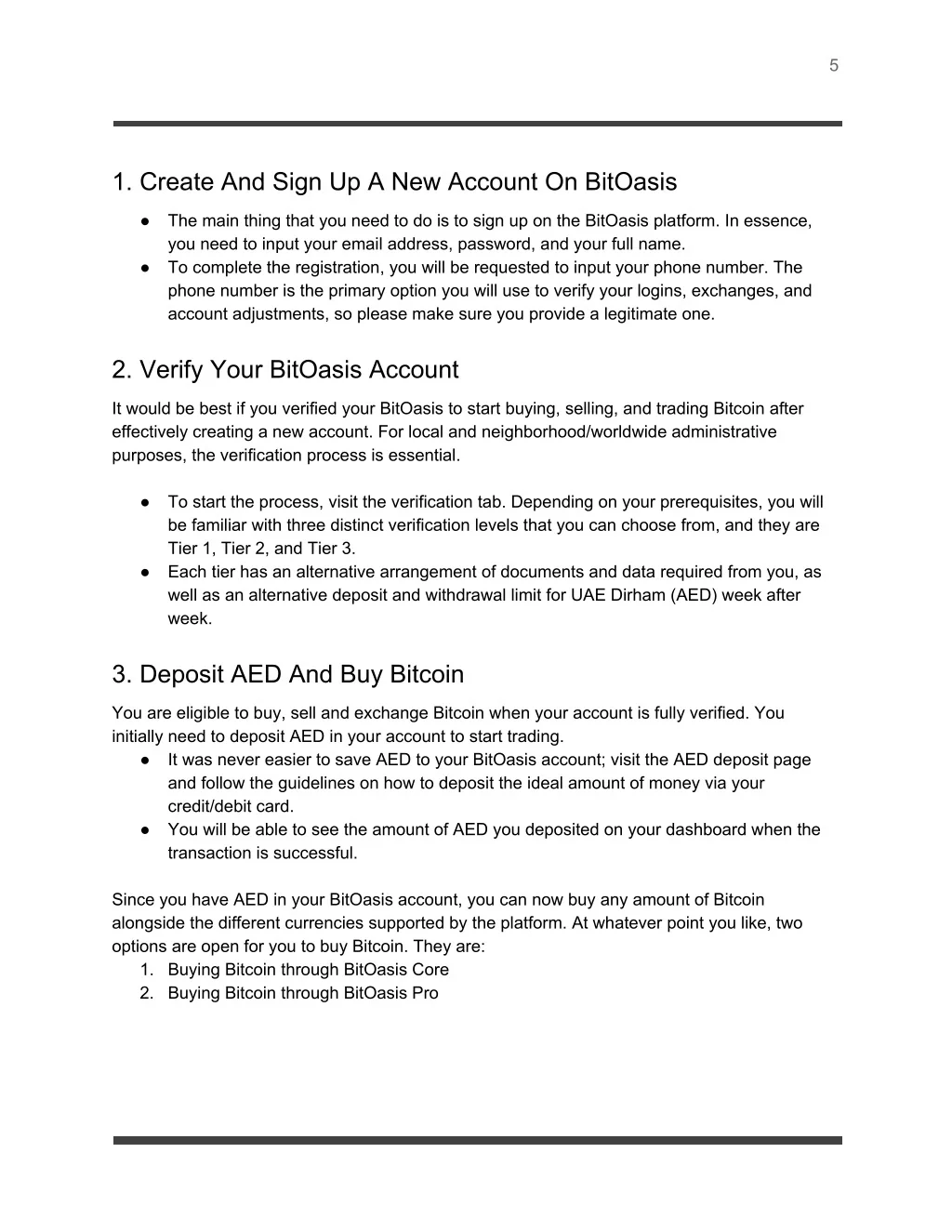5 1. Create And Sign Up A New Account On BitOasis ● The main thing that you need to do is to sign up on the BitOasis platform. In essence, you need to input your email address, password, and your full name. To complete the registration, you will be requested to input your phone number. The phone number is the primary option you will use to verify your logins, exchanges, and account adjustments, so please make sure you provide a legitimate one. ● 2. Verify Your BitOasis Account It would be best if you verified your BitOasis to start buying, selling, and trading Bitcoin after effectively creating a new account. For local and neighborhood/worldwide administrative purposes, the verification process is essential. ● To start the process, visit the verification tab. Depending on your prerequisites, you will be familiar with three distinct verification levels that you can choose from, and they are Tier 1, Tier 2, and Tier 3. ● Each tier has an alternative arrangement of documents and data required from you, as well as an alternative deposit and withdrawal limit for UAE Dirham (AED) week after week. 3. Deposit AED And Buy Bitcoin You are eligible to buy, sell and exchange Bitcoin when your account is fully verified. You initially need to deposit AED in your account to start trading. ● It was never easier to save AED to your BitOasis account; visit the AED deposit page and follow the guidelines on how to deposit the ideal amount of money via your credit/debit card. ● You will be able to see the amount of AED you deposited on your dashboard when the transaction is successful. Since you have AED in your BitOasis account, you can now buy any amount of Bitcoin alongside the different currencies supported by the platform. At whatever point you like, two options are open for you to buy Bitcoin. They are: 1. Buying Bitcoin through BitOasis Core 2. Buying Bitcoin through BitOasis Pro