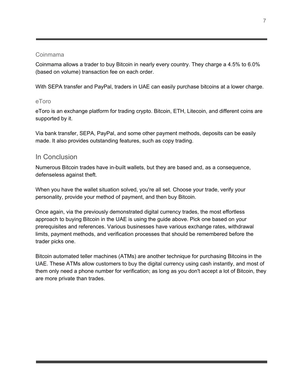 7 Coinmama Coinmama allows a trader to buy Bitcoin in nearly every country. They charge a 4.5% to 6.0% (based on volume) transaction fee on each order. With SEPA transfer and PayPal, traders in UAE can easily purchase bitcoins at a lower charge. eToro eToro is an exchange platform for trading crypto. Bitcoin, ETH, Litecoin, and different coins are supported by it. Via bank transfer, SEPA, PayPal, and some other payment methods, deposits can be easily made. It also provides outstanding features, such as copy trading. In Conclusion Numerous Bitcoin trades have in-built wallets, but they are based and, as a consequence, defenseless against theft. When you have the wallet situation solved, you're all set. Choose your trade, verify your personality, provide your method of payment, and then buy Bitcoin. Once again, via the previously demonstrated digital currency trades, the most effortless approach to buying Bitcoin in the UAE is using the guide above. Pick one based on your prerequisites and references. Various businesses have various exchange rates, withdrawal limits, payment methods, and verification processes that should be remembered before the trader picks one. Bitcoin automated teller machines (ATMs) are another technique for purchasing Bitcoins in the UAE. These ATMs allow customers to buy the digital currency using cash instantly, and most of them only need a phone number for verification; as long as you don't accept a lot of Bitcoin, they are more private than trades.