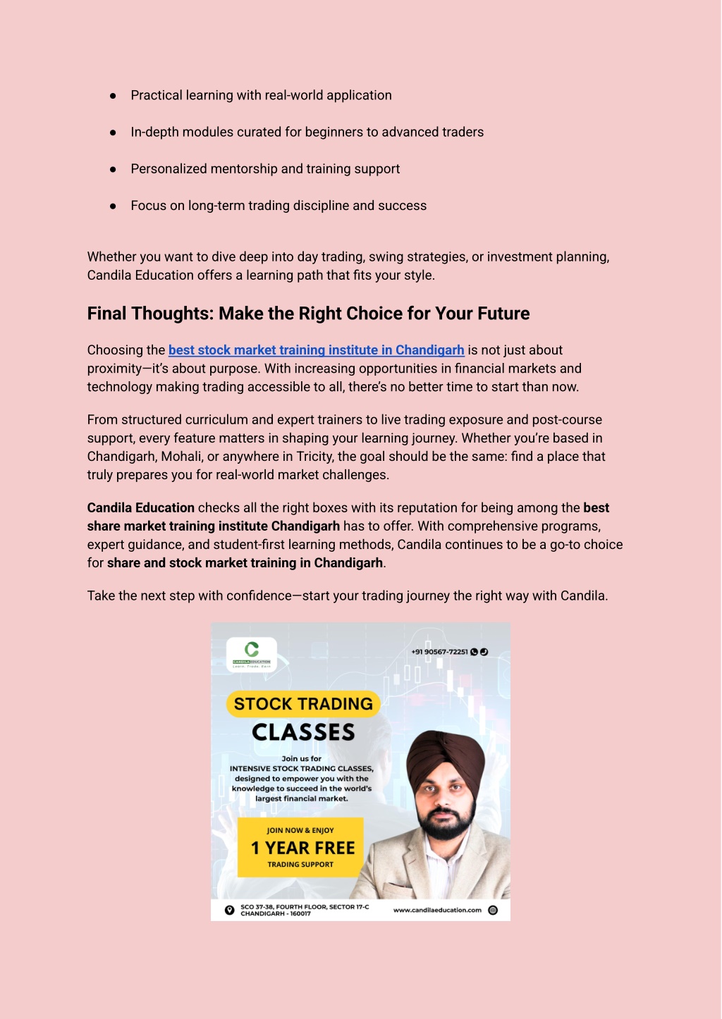 ● Anyone interested in financial independence If you fall into any of these categories, you’re already on the right path. The only thing left is to find the right training partner. The Tricity Advantage Chandigarh, Mohali, and Panchkula—collectively known as Tricity—are rapidly evolving education hubs. Students and professionals from these cities often seek specialized institutes to stay ahead. That’s why the best stock market training institute in Tricity isn’t just about location—it’s about delivering value in a dynamic, growing financial environment. With growing interest in stock trading and financial literacy, Tricity has become a hotbed for top-tier stock market education. If you're based in this region, now is the perfect time to take advantage of locally accessible training that meets global standards. Features of the Best Stock Market Courses in Chandigarh Want to know what makes the Best Stock Market Courses in Chandigarh stand out? Look for features like: ● Lifetime access to learning resources ● Certified programs recognized in the industry ● Free demo classes before enrolling ● Real-time doubt clearing and peer discussions ● Access to trading tools and platforms ● Post-course support or continued mentorship These are the hallmarks of a well-rounded and reliable program. Don’t settle for anything less. How Candila Stock Trading in Chandigarh Sets the Standard When searching for a reputed training center, names like Candila Stock Trading in Chandigarh and Candila Share Trading in Chandigarh often come up in conversations. That’s because Candila Education has been a consistent choice for students and professionals who are serious about mastering the markets. Candila’s approach combines: