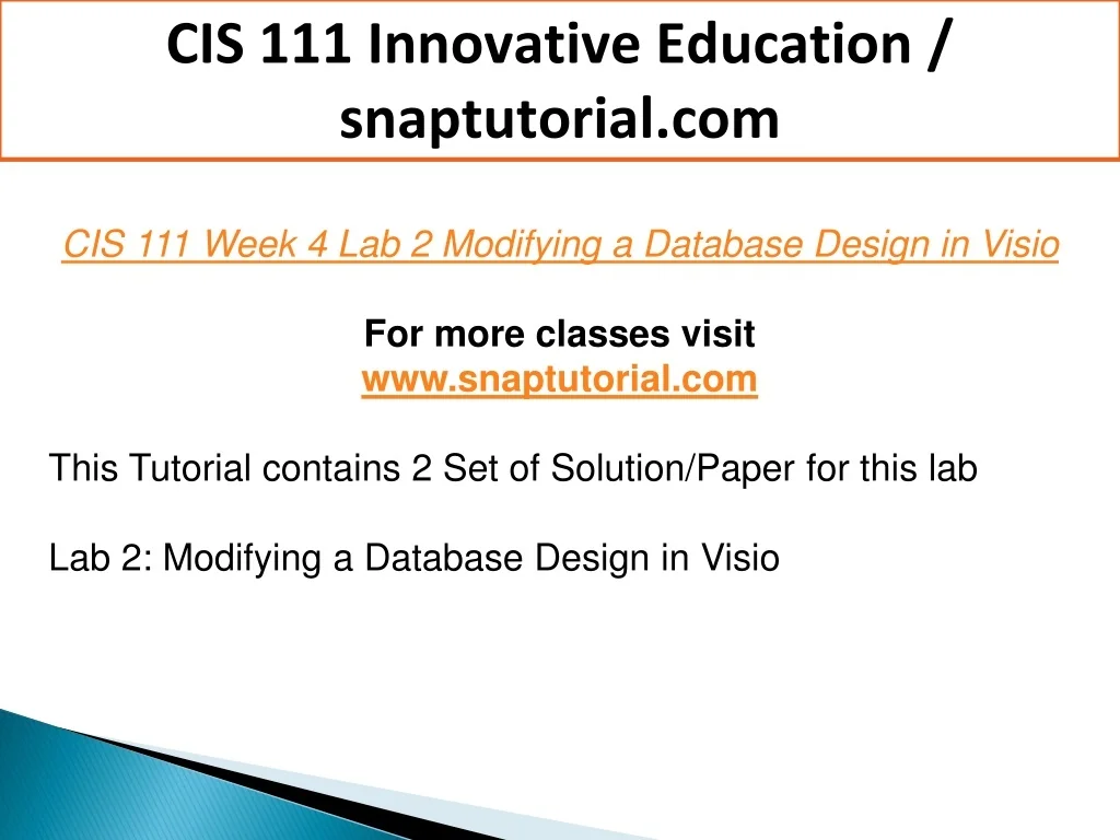 CIS 111 Innovative Education / snaptutorial.com CIS 111 Week 4 Lab 2 Modifying a Database Design in Visio For more classes visit www.snaptutorial.com This Tutorial contains 2 Set of Solution/Paper for this lab Lab 2: Modifying a Database Design in Visio