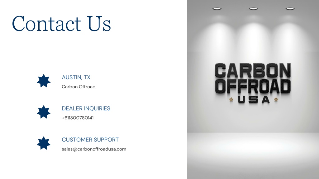 12. CUSTOMER SUPPORT • DEALER INQUIRIES • AUSTIN, TX • sales@carbonoffroadusa.com • +611300780141 • Carbon Offroad • Contact Us
