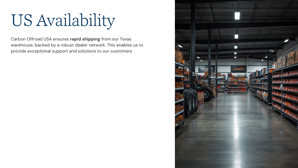 9. US Availability • Carbon Offroad USA ensures rapid shipping from our Texas warehouse, backed by a robust dealer network. This enables us to provide exceptional support and solutions to our customers.