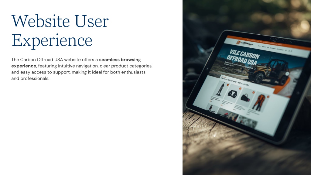 11. Website User Experience • The Carbon Offroad USA website offers a seamless browsing experience, featuring intuitive navigation, clear product categories, and easy access to support, making it ideal for both enthusiasts and professionals.