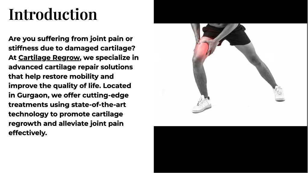 Introduction Introduction Are you suffering from joint pain or stiffness due to damaged cartilage? At Cartilage Regrow, we specialize in advanced cartilage repair solutions that help restore mobility and improve the quality of life. Located in Gurgaon, we offer cutting-edge treatments using state-of-the-art technology to promote cartilage regrowth and alleviate joint pain effectively. effectively. Are you suffering from joint pain or stiffness due to damaged cartilage? At Cartilage Regrow, we specialize in advanced cartilage repair solutions that help restore mobility and improve the quality of life. Located in Gurgaon, we offer cutting-edge treatments using state-of-the-art technology to promote cartilage regrowth and alleviate joint pain