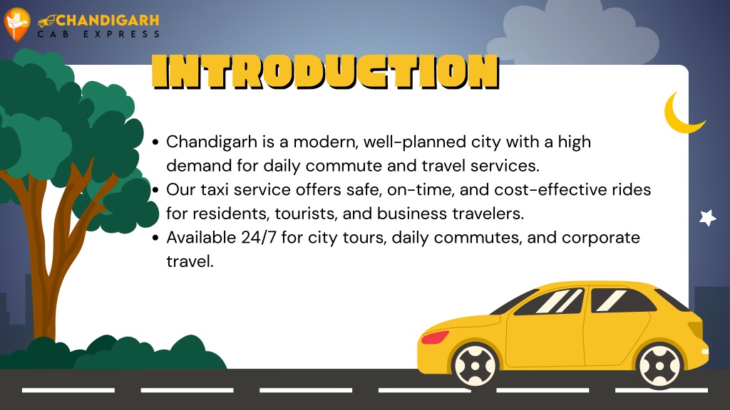 INTRODUCTION INTRODUCTION Chandigarh is a modern, well-planned city with a high demand for daily commute and travel services. Our taxi service offers safe, on-time, and cost-effective rides for residents, tourists, and business travelers. Available 24/7 for city tours, daily commutes, and corporate travel.