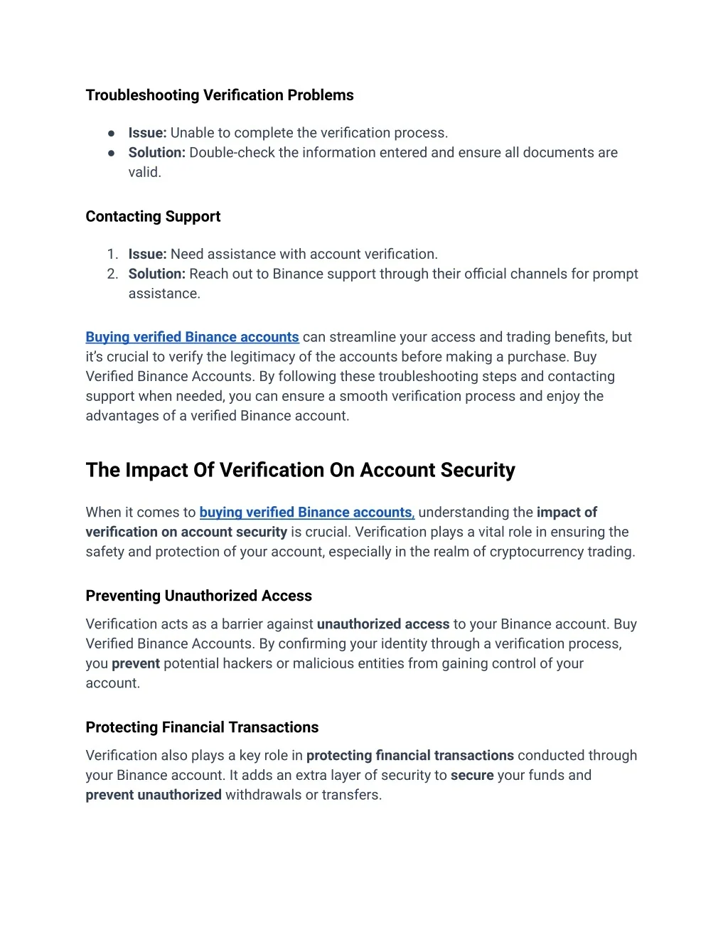 Troubleshooting Verification Problems ● Issue: Unable to complete the verification process. ● Solution: Double-check the information entered and ensure all documents are valid. Contacting Support 1. Issue: Need assistance with account verification. 2. Solution: Reach out to Binance support through their official channels for prompt assistance. Buying verified Binance accounts can streamline your access and trading benefits, but it’s crucial to verify the legitimacy of the accounts before making a purchase. Buy Verified Binance Accounts. By following these troubleshooting steps and contacting support when needed, you can ensure a smooth verification process and enjoy the advantages of a verified Binance account. The Impact Of Verification On Account Security When it comes to buying verified Binance accounts, understanding the impact of verification on account security is crucial. Verification plays a vital role in ensuring the safety and protection of your account, especially in the realm of cryptocurrency trading. Preventing Unauthorized Access Verification acts as a barrier against unauthorized access to your Binance account. Buy Verified Binance Accounts. By confirming your identity through a verification process, you prevent potential hackers or malicious entities from gaining control of your account. Protecting Financial Transactions Verification also plays a key role in protecting financial transactions conducted through your Binance account. It adds an extra layer of security to secure your funds and prevent unauthorized withdrawals or transfers.