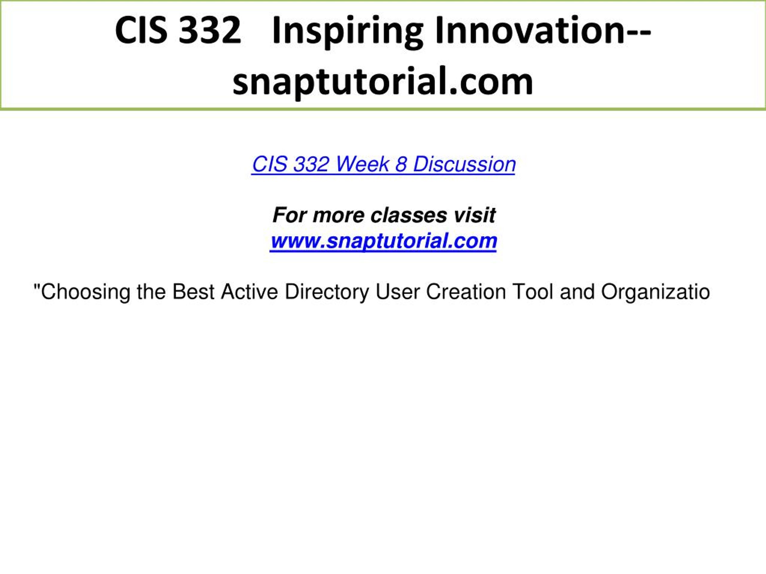 CIS 332 Inspiring Innovation--snaptutorial.com CIS 332 Week 8 Discussion For more classes visit www.snaptutorial.com "Choosing the Best Active Directory User Creation Tool and Organizatio