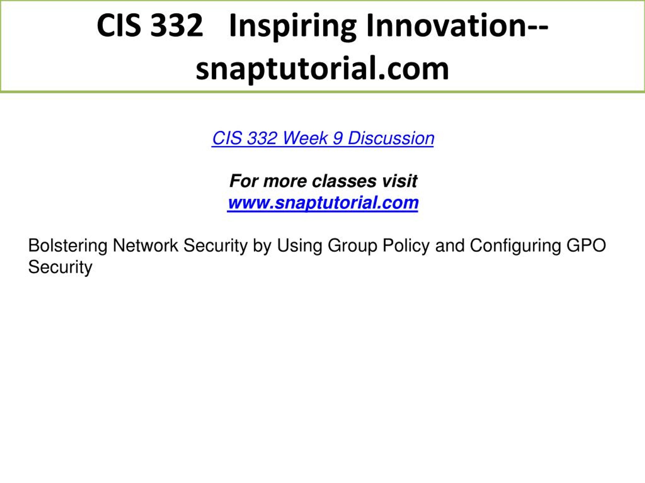 CIS 332 Inspiring Innovation--snaptutorial.com CIS 332 Week 9 Discussion For more classes visit www.snaptutorial.com Bolstering Network Security by Using Group Policy and Configuring GPO Security