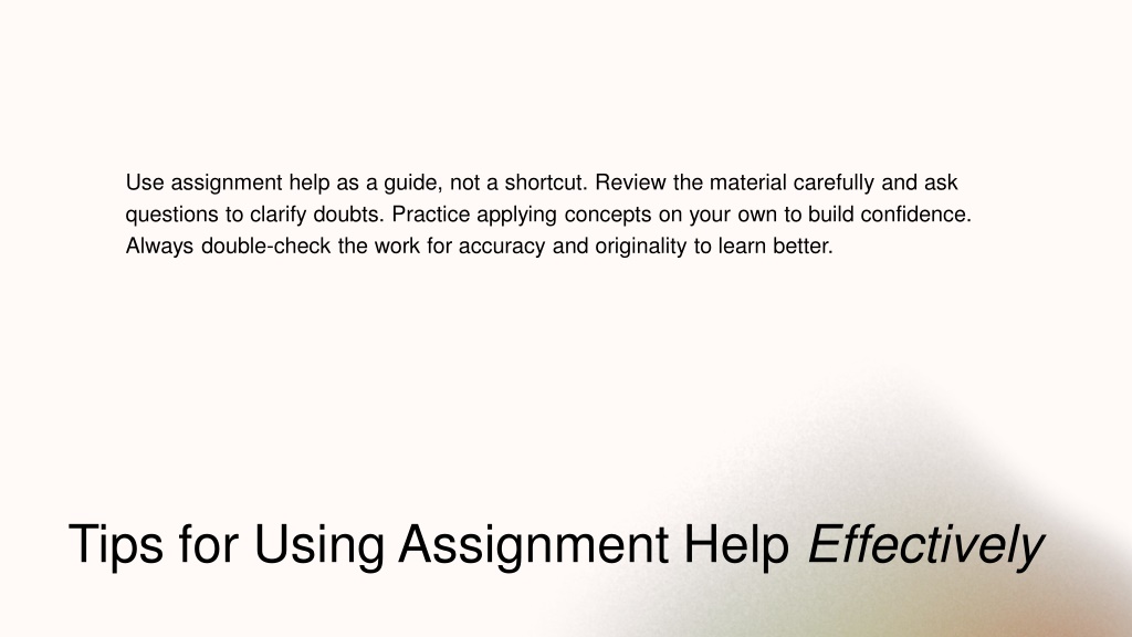 10. Use assignment help as a guide, not a shortcut. Review the material carefully and ask questions to clarify doubts. Practice applying concepts on your own to build confidence. Always double-check the work for accuracy and originality to learn better. Tips for Using Assignment Help Effectively