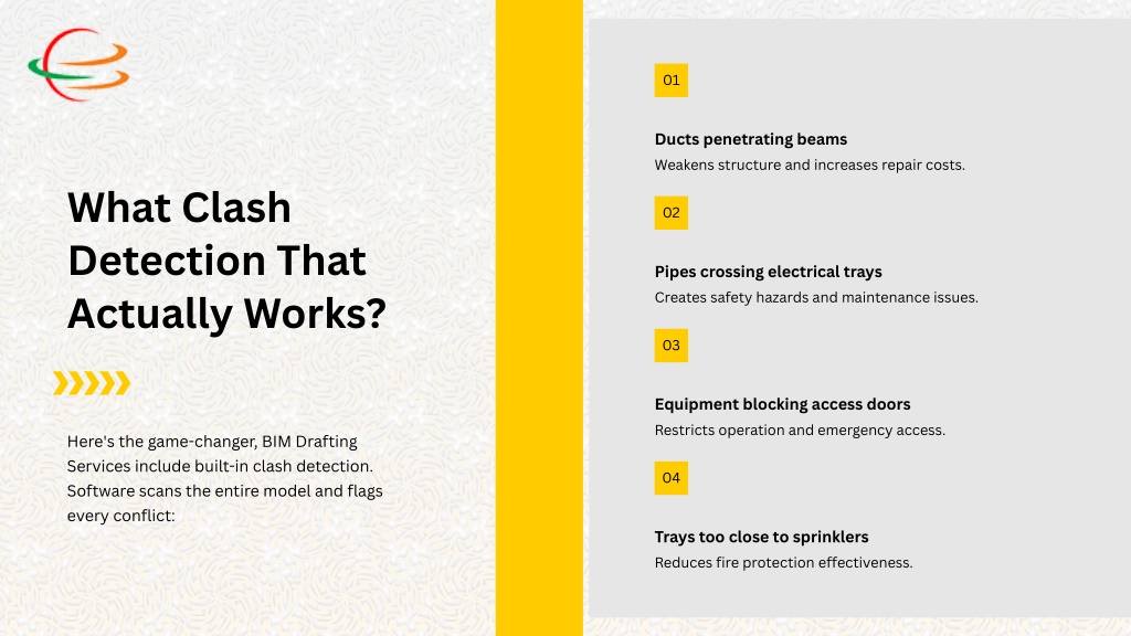 01 Ducts penetrating beams Weakens structure and increases repair costs. What Clash Detection That Actually Works? 02 Pipes crossing electrical trays Creates safety hazards and maintenance issues. 03 Equipment blocking access doors Restricts operation and emergency access. Here's the game-changer, BIM Drafting Services include built-in clash detection. Software scans the entire model and flags every conflict: 04 Trays too close to sprinklers Reduces fire protection effectiveness.