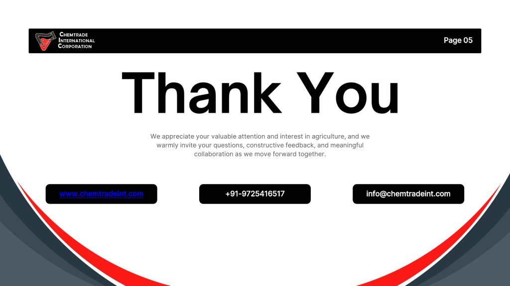 info@chemtradeint.com +91-9725416517 www.chemtradeint.com Page 05 Thank You We appreciate your valuable attention and interest in agriculture, and we warmly invite your questions, constructive feedback, and meaningful collaboration as we move forward together.