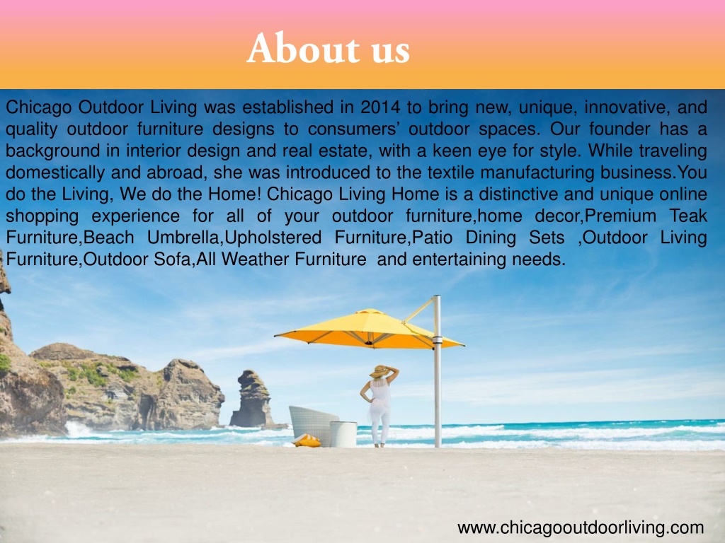About us Chicago Outdoor Living was established in 2014 to bring new, unique, innovative, and quality outdoor furniture designs to consumers’ outdoor spaces. Our founder has a background in interior design and real estate, with a keen eye for style. While traveling domestically and abroad, she was introduced to the textile manufacturing business.You do the Living, We do the Home! Chicago Living Home is a distinctive and unique online shopping experience for all of your outdoor furniture,home decor,Premium Teak Furniture,Beach Umbrella,Upholstered Furniture,Patio Dining Sets ,Outdoor Living Furniture,Outdoor Sofa,All Weather Furniture and entertaining needs. www.chicagooutdoorliving.com