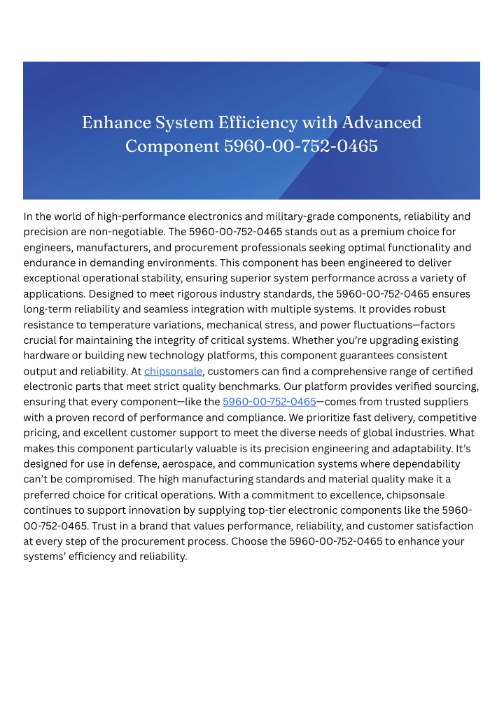 1. Enhance System Efficiency with Advanced Component 5960-00-752-0465 In the world of high-performance electronics and military-grade components, reliability and precision are non-negotiable. The 5960-00-752-0465 stands out as a premium choice for engineers, manufacturers, and procurement professionals seeking optimal functionality and endurance in demanding environments. This component has been engineered to deliver exceptional operational stability, ensuring superior system performance across a variety of applications. Designed to meet rigorous industry standards, the 5960-00-752-0465 ensures long-term reliability and seamless integration with multiple systems. It provides robust resistance to temperature variations, mechanical stress, and power fluctuations—factors crucial for maintaining the integrity of critical systems. Whether you’re upgrading existing hardware or building new technology platforms, this component guarantees consistent output and reliability. At chipsonsale, customers can find a comprehensive range of certified electronic parts that meet strict quality benchmarks. Our platform provides verified sourcing, ensuring that every component—like the 5960-00-752-0465—comes from trusted suppliers with a proven record of performance and compliance. We prioritize fast delivery, competitive pricing, and excellent customer support to meet the diverse needs of global industries. What makes this component particularly valuable is its precision engineering and adaptability. It’s designed for use in defense, aerospace, and communication systems where dependability can’t be compromised. The high manufacturing standards and material quality make it a preferred choice for critical operations. With a commitment to excellence, chipsonsale continues to support innovation by supplying top-tier electronic components like the 5960- 00-752-0465. Trust in a brand that values performance, reliability, and customer satisfaction at every step of the procurement process. Choose the 5960-00-752-0465 to enhance your systems’ efficiency and reliability.
