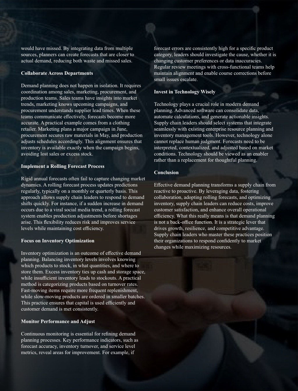 would have missed. By integrating data from multiple sources, planners can create forecasts that are closer to actual demand, reducing both waste and missed sales. forecast errors are consistently high for a specific product category, leaders should investigate the cause, whether it is changing customer preferences or data inaccuracies. Regular review meetings with cross-functional teams help maintain alignment and enable course corrections before small issues escalate. Demand Planning Best Practices for Supply Chain Leaders Collaborate Across Departments Demand planning does not happen in isolation. It requires coordination among sales, marketing, procurement, and production teams. Sales teams have insights into market trends, marketing knows upcoming campaigns, and procurement understands supplier lead times. When these teams communicate effectively, forecasts become more accurate. A practical example comes from a clothing retailer. Marketing plans a major campaign in June, procurement secures raw materials in May, and production adjusts schedules accordingly. This alignment ensures that inventory is available exactly when the campaign begins, avoiding lost sales or excess stock. Invest in Technology Wisely Technology plays a crucial role in modern demand planning. Advanced software can consolidate data, automate calculations, and generate actionable insights. Supply chain leaders should select systems that integrate seamlessly with existing enterprise resource planning and inventory management tools. However, technology alone cannot replace human judgment. Forecasts need to be interpreted, contextualized, and adjusted based on market conditions. Technology should be viewed as an enabler rather than a replacement for thoughtful planning. D emand planning is a cornerstone of supply chain management, yet it is often treated as a secondary task in many organizations. According to a study by Gartner, companies that implement accurate demand planning processes can reduce inventory costs by up to 25% while improving service levels by 20%. This illustrates the tangible impact effective demand planning can have. Supply chain leaders who adopt structured practices in forecasting, data integration, and collaboration can create a more responsive and resilient supply chain. Implement a Rolling Forecast Process Conclusion Rigid annual forecasts often fail to capture changing market dynamics. A rolling forecast process updates predictions regularly, typically on a monthly or quarterly basis. This approach allows supply chain leaders to respond to demand shifts quickly. For instance, if a sudden increase in demand occurs due to a viral social media trend, a rolling forecast system enables production adjustments before shortages arise. This flexibility reduces risk and improves service levels while maintaining cost efficiency. Effective demand planning transforms a supply chain from reactive to proactive. By leveraging data, fostering collaboration, adopting rolling forecasts, and optimizing inventory, supply chain leaders can reduce costs, improve customer satisfaction, and enhance overall operational efficiency. What this really means is that demand planning is not a back-office function. It is a strategic lever that drives growth, resilience, and competitive advantage. Supply chain leaders who master these practices position their organizations to respond confidently to market changes while maximizing resources. Understand the Importance of Demand Planning Demand planning is more than just predicting sales. It involves anticipating customer needs, aligning inventory levels, and ensuring that production meets demand without creating waste. Poor demand planning can result in overstocking, stockouts, and missed revenue opportunities. Consider a mid-sized electronics retailer. Without proper demand planning, a new product launch could either face empty shelves or excess inventory that ties up capital. In both scenarios, the business loses. Supply chain leaders must view demand planning as a strategic function that balances customer satisfaction with operational efficiency. Focus on Inventory Optimization Inventory optimization is an outcome of effective demand planning. Balancing inventory levels involves knowing which products to stock, in what quantities, and where to store them. Excess inventory ties up cash and storage space, while insufficient inventory leads to stockouts. A practical method is categorizing products based on turnover rates. Fast-moving items require more frequent replenishment, while slow-moving products are ordered in smaller batches. This practice ensures that capital is used efficiently and customer demand is met consistently. Leverage Historical Data and Analytics Historical sales data forms the backbone of demand planning. However, it should not be the only reference point. Supply chain leaders need to combine past sales trends with market intelligence, seasonal variations, and promotional calendars. Advanced analytics tools can help identify patterns that are not immediately visible. For example, a consumer goods company analyzing three years of data may discover that demand spikes during certain local festivals, which traditional quarterly forecasting Monitor Performance and Adjust Continuous monitoring is essential for refining demand planning processes. Key performance indicators, such as forecast accuracy, inventory turnover, and service level metrics, reveal areas for improvement. For example, if