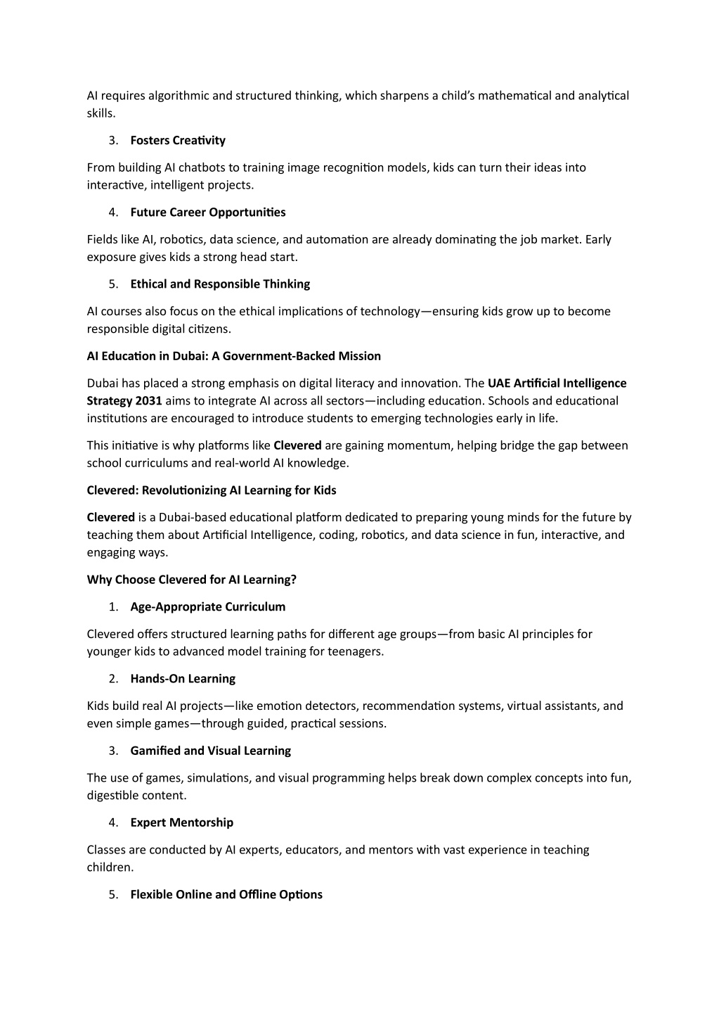 AI requires algorithmic and structured thinking, which sharpens a child’s mathematical and analytical skills. 3.Fosters Creativity From building AI chatbots to training image recognition models, kids can turn their ideas into interactive, intelligent projects. 4.Future Career Opportunities Fields like AI, robotics, data science, and automation are already dominating the job market. Early exposure gives kids a strong head start. 5.Ethical and Responsible Thinking AI courses also focus on the ethical implications of technology—ensuring kids grow up to become responsible digital citizens. AI Education in Dubai: A Government-Backed Mission Dubai has placed a strong emphasis on digital literacy and innovation. TheUAE Artificial Intelligence Strategy 2031aims to integrate AI across all sectors—including education. Schools and educational institutions are encouraged to introduce students to emerging technologies early in life. This initiative is why platforms likeCleveredare gaining momentum, helping bridge the gap between school curriculums and real-world AI knowledge. Clevered: Revolutionizing AI Learning for Kids Cleveredis a Dubai-based educational platform dedicated to preparing young minds for the future by teaching them about Artificial Intelligence, coding, robotics, and data science in fun, interactive, and engaging ways. Why Choose Clevered for AI Learning? 1.Age-Appropriate Curriculum Clevered offers structured learning paths for different age groups—from basic AI principles for younger kids to advanced model training for teenagers. 2.Hands-On Learning Kids build real AI projects—like emotion detectors, recommendation systems, virtual assistants, and even simple games—through guided, practical sessions. 3.Gamified and Visual Learning The use of games, simulations, and visual programming helps break down complex concepts into fun, digestible content. 4.Expert Mentorship Classes are conducted by AI experts, educators, and mentors with vast experience in teaching children. 5.Flexible Online and Offline Options