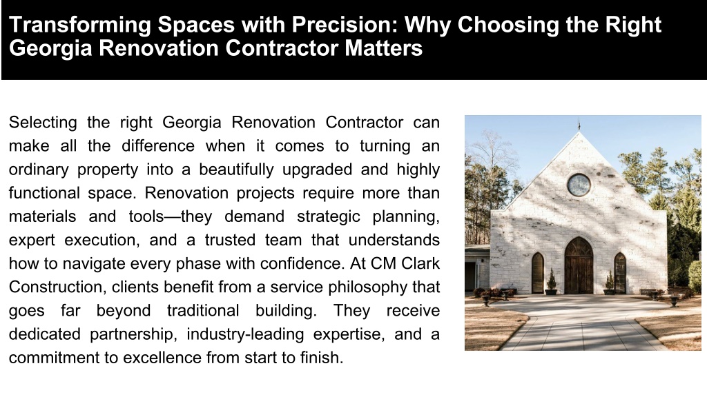 Transforming Spaces with Precision: Why Choosing the Right Georgia Renovation Contractor Matters Selecting the right Georgia Renovation Contractor can make all the difference when it comes to turning an ordinary property into a beautifully upgraded and highly functional space. Renovation projects require more than materials and tools—they demand strategic planning, expert execution, and a trusted team that understands how to navigate every phase with confidence. At CM Clark Construction, clients benefit from a service philosophy that goes far beyond traditional building. They receive dedicated partnership, industry-leading expertise, and a commitment to excellence from start to finish.