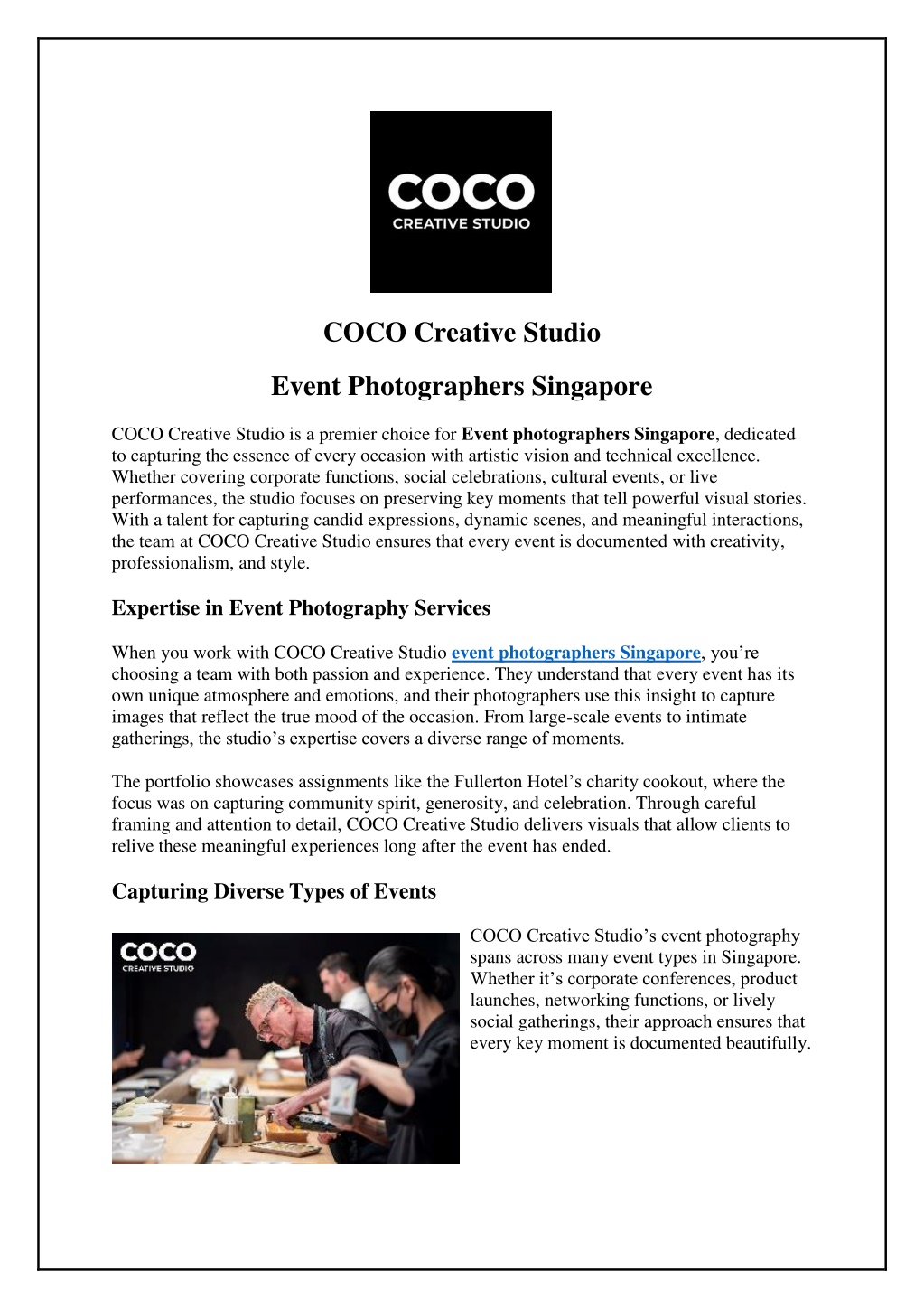 COCO Creative Studio Event Photographers Singapore COCO Creative Studio is a premier choice for Event photographers Singapore, dedicated to capturing the essence of every occasion with artistic vision and technical excellence. Whether covering corporate functions, social celebrations, cultural events, or live performances, the studio focuses on preserving key moments that tell powerful visual stories. With a talent for capturing candid expressions, dynamic scenes, and meaningful interactions, the team at COCO Creative Studio ensures that every event is documented with creativity, professionalism, and style. Expertise in Event Photography Services When you work with COCO Creative Studio event photographers Singapore, you’re choosing a team with both passion and experience. They understand that every event has its own unique atmosphere and emotions, and their photographers use this insight to capture images that reflect the true mood of the occasion. From large-scale events to intimate gatherings, the studio’s expertise covers a diverse range of moments. The portfolio showcases assignments like the Fullerton Hotel’s charity cookout, where the focus was on capturing community spirit, generosity, and celebration. Through careful framing and attention to detail, COCO Creative Studio delivers visuals that allow clients to relive these meaningful experiences long after the event has ended. Capturing Diverse Types of Events COCO Creative Studio’s event photography spans across many event types in Singapore. Whether it’s corporate conferences, product launches, networking functions, or lively social gatherings, their approach ensures that every key moment is documented beautifully.