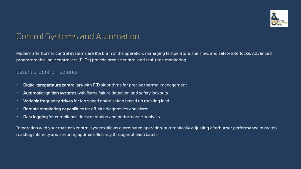 Control Systems and Automation Control Systems and Automation Modern afterburner control systems are the brain of the operation, managing temperature, fuel flow, and safety interlocks. Advanced programmable logic controllers (PLCs) provide precise control and real-time monitoring. Essential Control Features: • Digital temperature controllers Digital temperature controllers with PID algorithms for precise thermal management • Automatic ignition systems Automatic ignition systems with flame failure detection and safety lockouts • Variable frequency drives Variable frequency drives for fan speed optimization based on roasting load • Remote monitoring capabilities Remote monitoring capabilities for off-site diagnostics and alerts • Data logging Data logging for compliance documentation and performance analysis Integration with your roaster's control system allows coordinated operation, automatically adjusting afterburner performance to match roasting intensity and ensuring optimal efficiency throughout each batch.