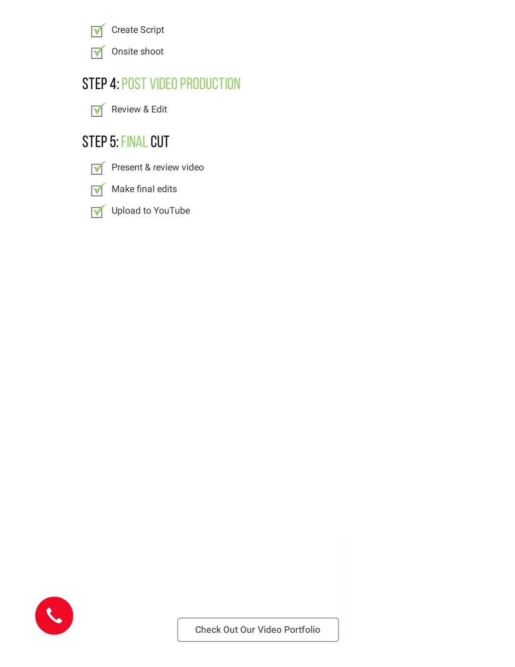 Create Script Onsite shoot Step 4: Post Video Production Review & Edit Step 5: Final Cut Present & review video Make ?nal edits Upload to YouTube Check Out Our Video Portfolio
