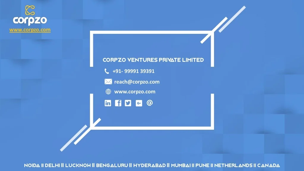 www.corpzo.com corpzo Ventures Priv ate Limited +91- 99991 39391 reach@corpzo.com www.corpzo.com NOIDA || DELHI || LUCKNOW || BENGALURU || HYDERABAD || MUMBAI || PUNE || NETHERLANDS || CANADA