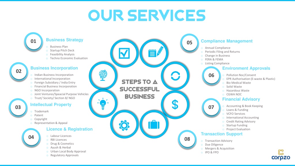 Our Services Business Strategy Compliance Management 01 05 o Business Plan o Startup Pitch Deck o Feasibility Analysis o Techno Economic Evaluation o Annual Compliance o Periodic Filing and Returns o Change in Business o FERA & FEMA o ListingCompliance Business Incorporation Environment Approvals 02 06 o Indian Business Incorporation o InternationalIncorporation o Foreign Subsidiary / India Entry o Financial Business Incorporation o NGO Incorporation o Joint Ventures/Speacial Purpose Vehicles o Trust/ Society/Section 8/ NGO o PollutionNoc/Consent o EPR Authorisation(E-waste & Plastic) o Bio MedicalWaste o Solid Waste o Hazardous Waste o CGWA NOC Financial Advisory Steps to a Steps to a Successful Successful Business Business Intellectual Property o Accounting & Book Keeping o Loans & Funding o VCFO Services o InternationalAccounting o Credit Rating Advisory o Startup Funding o ProjectEvaluation 07 03 o Trademark o Patent o Copyright o Representation& Appeal Licence & Registration Transaction Support o LabourLicences o RBI Licences o Drug & Cosmetics o Ayush & Herbal o Urban LocalBody Approval o Regulatory Approvals 04 08 o Transaction Advisory o Due Diligence o Mergers & Acquisition o IPO & FPO