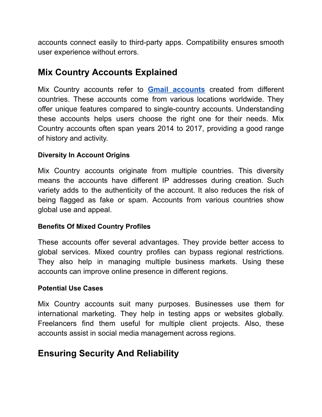 accounts connect easily to third-party apps. Compatibility ensures smooth user experience without errors. Mix Country Accounts Explained Mix Country accounts refer to Gmail accounts created from different countries. These accounts come from various locations worldwide. They offer unique features compared to single-country accounts. Understanding these accounts helps users choose the right one for their needs. Mix Country accounts often span years 2014 to 2017, providing a good range of history and activity. Diversity In Account Origins Mix Country accounts originate from multiple countries. This diversity means the accounts have different IP addresses during creation. Such variety adds to the authenticity of the account. It also reduces the risk of being flagged as fake or spam. Accounts from various countries show global use and appeal. Benefits Of Mixed Country Profiles These accounts offer several advantages. They provide better access to global services. Mixed country profiles can bypass regional restrictions. They also help in managing multiple business markets. Using these accounts can improve online presence in different regions. Potential Use Cases Mix Country accounts suit many purposes. Businesses use them for international marketing. They help in testing apps or websites globally. Freelancers find them useful for multiple client projects. Also, these accounts assist in social media management across regions. Ensuring Security And Reliability