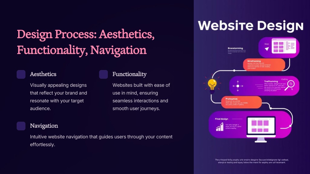 Design Process: Aesthetics, Functionality, Navigation Aesthetics Functionality Visually appealing designs that reflect your brand and resonate with your target audience. Websites built with ease of use in mind, ensuring seamless interactions and smooth user journeys. Navigation Intuitive website navigation that guides users through your content effortlessly.