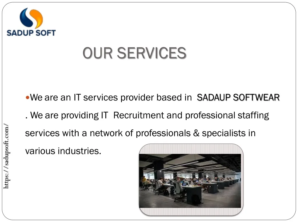 OUR SERVICES • We are an IT services provider based in SADAUP SOFTWEAR . We are providing IT Recruitment and professional staffing services with a network of professionals & specialistsin variousindustries. https://sadupsoft.com/