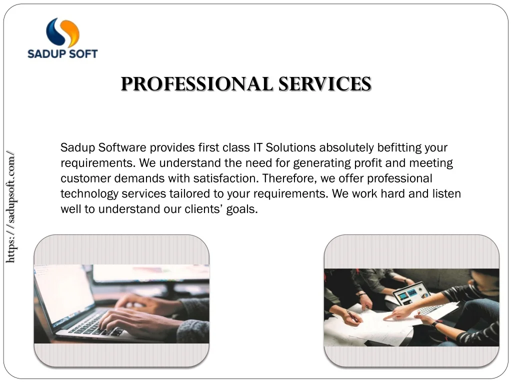 PROFESSIONAL SERVICES Sadup Software provides first class IT Solutions absolutely befitting your requirements. We understand the need for generating profit and meeting customer demands with satisfaction. Therefore, we offer professional technology services tailored to your requirements. We work hard and listen well to understand our clients’ goals. https://sadupsoft.com/