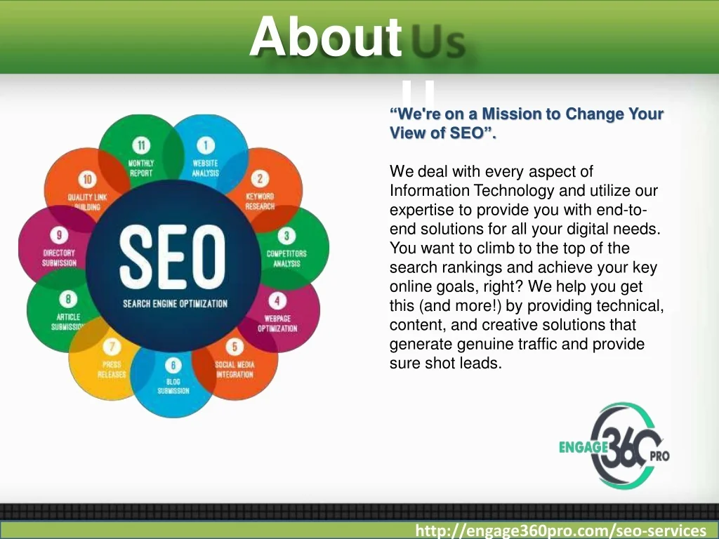 About U View of SEO”. “We're on a Mission to Change Your s We deal with every aspect of Information Technology and utilize our expertise to provide you with end-to- end solutions for all your digital needs. You want to climb to the top of the search rankings and achieve your key online goals, right? We help you get this (and more!) by providing technical, content, and creative solutions that generate genuine traffic and provide sure shot leads. http://engage360pro.com/seo-services
