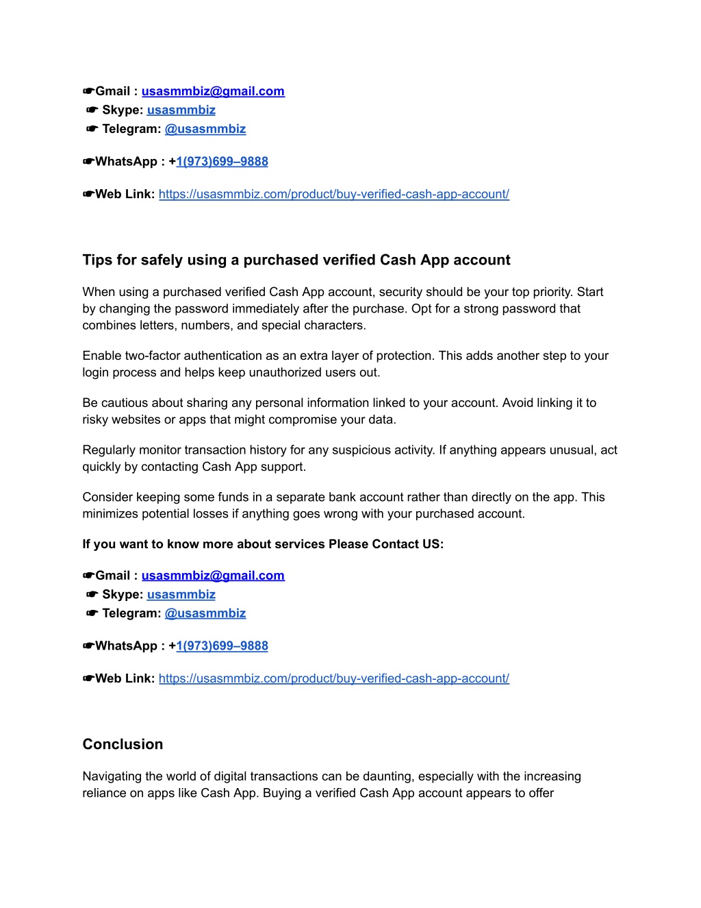 convenience and additional features that many users seek. However, it’s crucial to weigh the benefits against potential risks. A verified account enhances your transaction limits and adds an extra layer of security to your financial dealings. Understanding how to purchase one safely is essential for ensuring your money stays secure. Always take time to research sellers thoroughly and consider factors such as reputation and user reviews. While purchasing a verified account from third-party sellers might seem tempting, it can expose you to scams or accounts that could be flagged by Cash App itself. Being cautious will help protect both your identity and finances. Should you decide to buy a verified Cash App account, follow best practices for safety in online transactions. Use strong passwords, enable two-factor authentication when possible, and monitor your transactions regularly. Buying a verified Cash App account can open up new possibilities but requires careful consideration before proceeding. If you want to know more about services Please Contact US: ☛Gmail : usasmmbiz@gmail.com ☛ Skype: usasmmbiz ☛ Telegram: @usasmmbiz ☛WhatsApp : +1(973)699–9888 ☛Web Link: https://usasmmbiz.com/product/buy-verified-cash-app-account/
