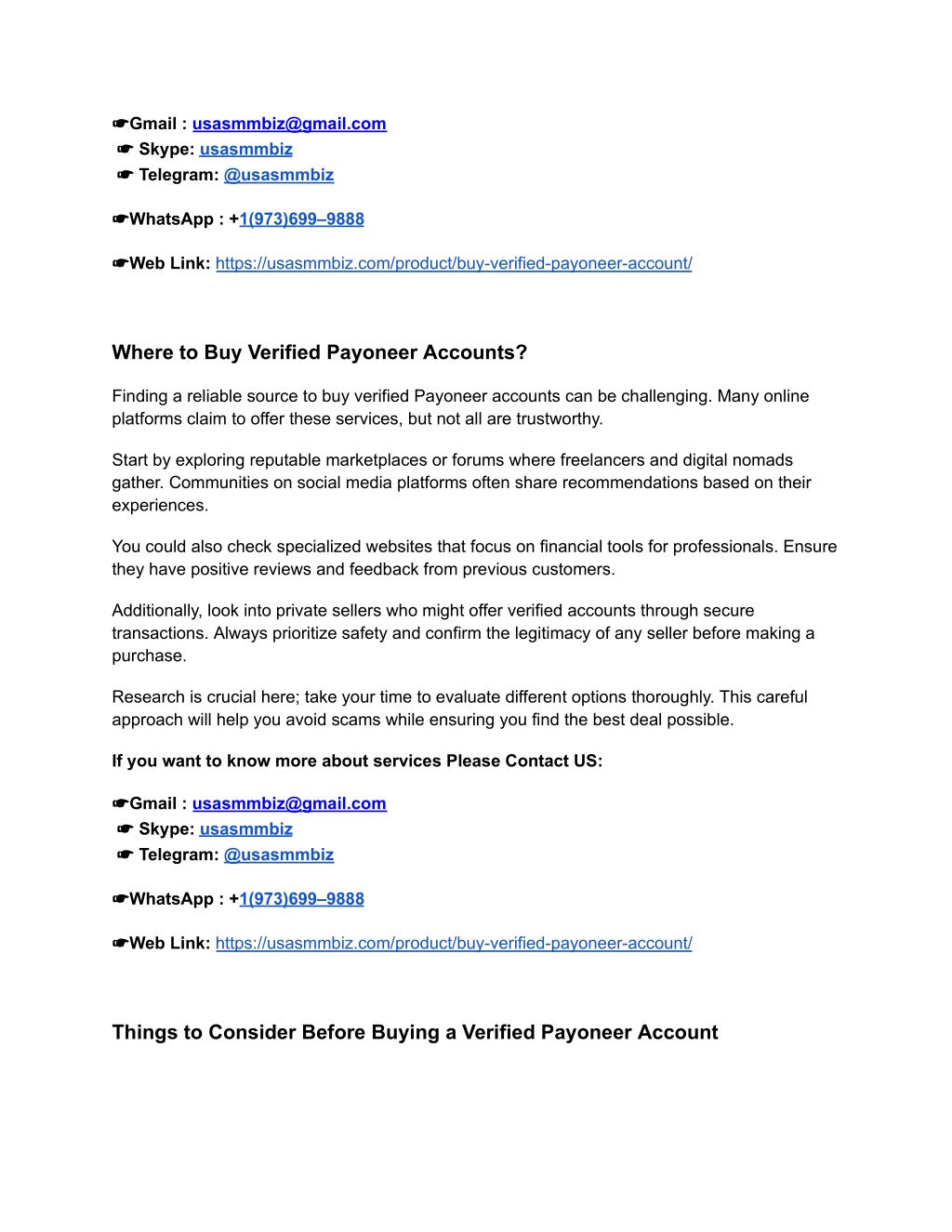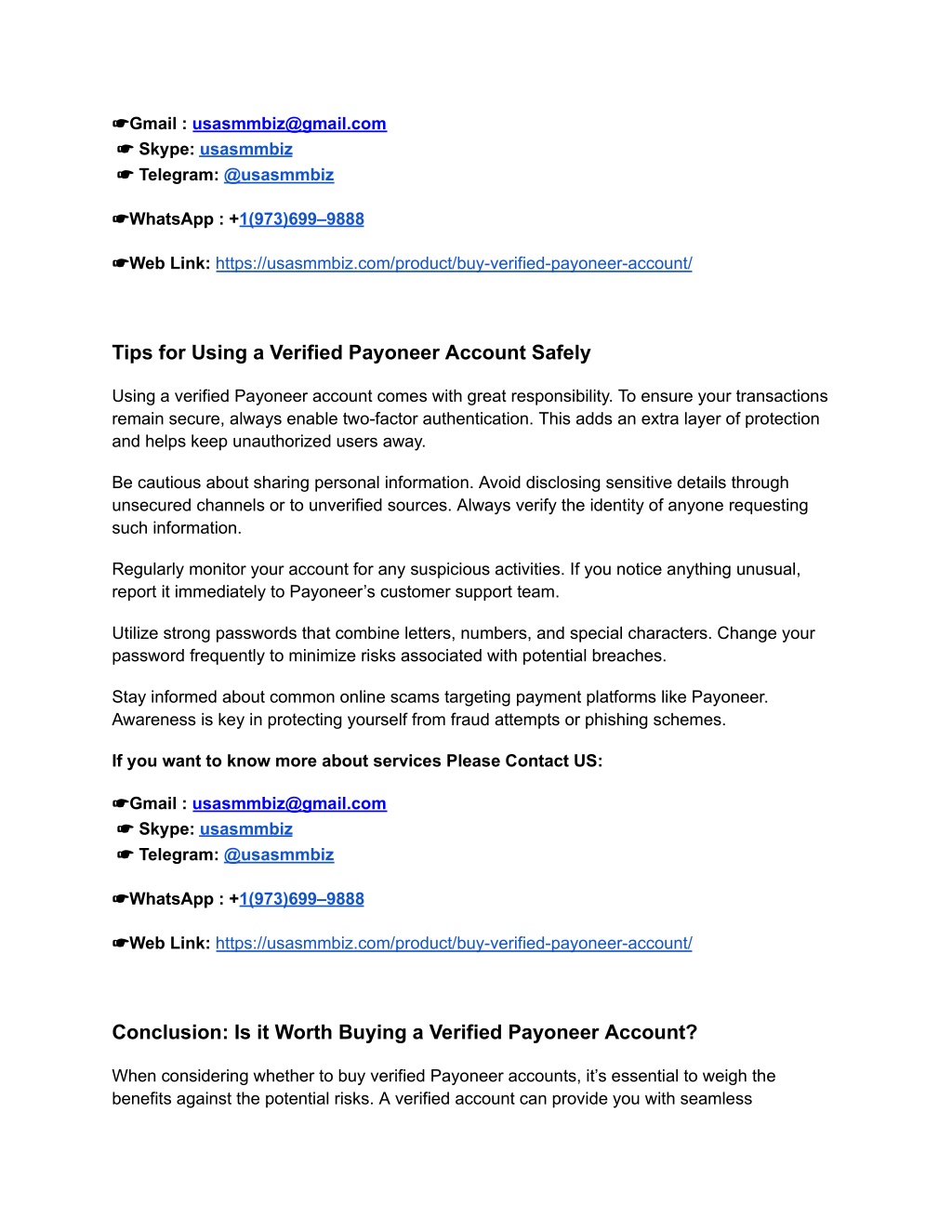 ☛Gmail : usasmmbiz@gmail.com ☛ Skype: usasmmbiz ☛ Telegram: @usasmmbiz ☛WhatsApp : +1(973)699–9888 ☛Web Link: https://usasmmbiz.com/product/buy-verified-payoneer-account/ Tips for Using a Verified Payoneer Account Safely Using a verified Payoneer account comes with great responsibility. To ensure your transactions remain secure, always enable two-factor authentication. This adds an extra layer of protection and helps keep unauthorized users away. Be cautious about sharing personal information. Avoid disclosing sensitive details through unsecured channels or to unverified sources. Always verify the identity of anyone requesting such information. Regularly monitor your account for any suspicious activities. If you notice anything unusual, report it immediately to Payoneer’s customer support team. Utilize strong passwords that combine letters, numbers, and special characters. Change your password frequently to minimize risks associated with potential breaches. Stay informed about common online scams targeting payment platforms like Payoneer. Awareness is key in protecting yourself from fraud attempts or phishing schemes. If you want to know more about services Please Contact US: ☛Gmail : usasmmbiz@gmail.com ☛ Skype: usasmmbiz ☛ Telegram: @usasmmbiz ☛WhatsApp : +1(973)699–9888 ☛Web Link: https://usasmmbiz.com/product/buy-verified-payoneer-account/ Conclusion: Is it Worth Buying a Verified Payoneer Account? When considering whether to buy verified Payoneer accounts, it’s essential to weigh the benefits against the potential risks. A verified account can provide you with seamless