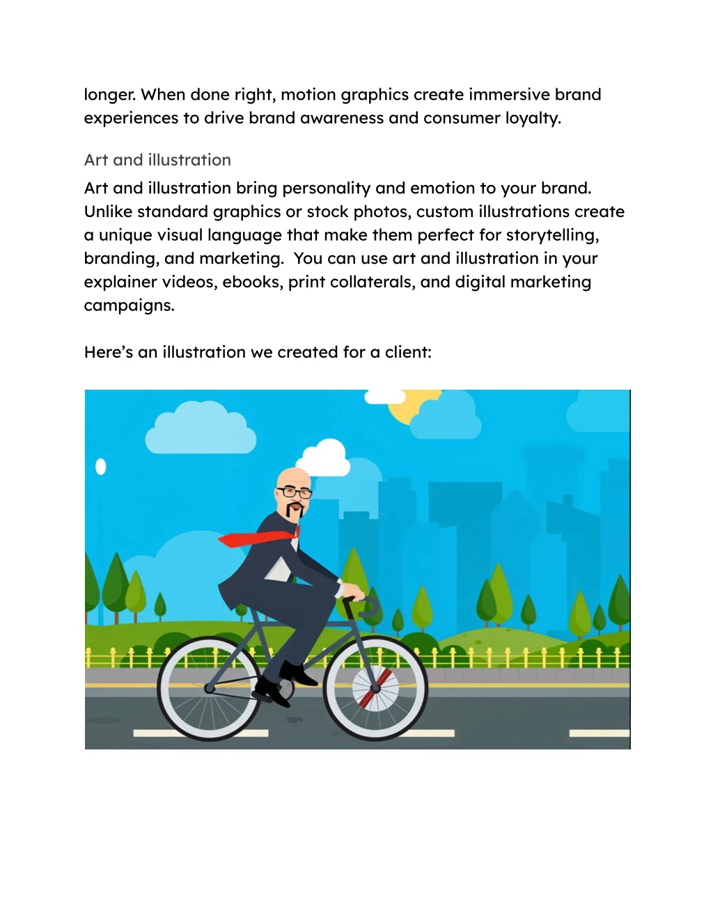 longer. When done right, motion graphics create immersive brand experiences to drive brand awareness and consumer loyalty. Art and illustration Art and illustration bring personality and emotion to your brand. Unlike standard graphics or stock photos, custom illustrations create a unique visual language that make them perfect for storytelling, branding, and marketing. You can use art and illustration in your explainer videos, ebooks, print collaterals, and digital marketing campaigns. Here’s an illustration we created for a client: