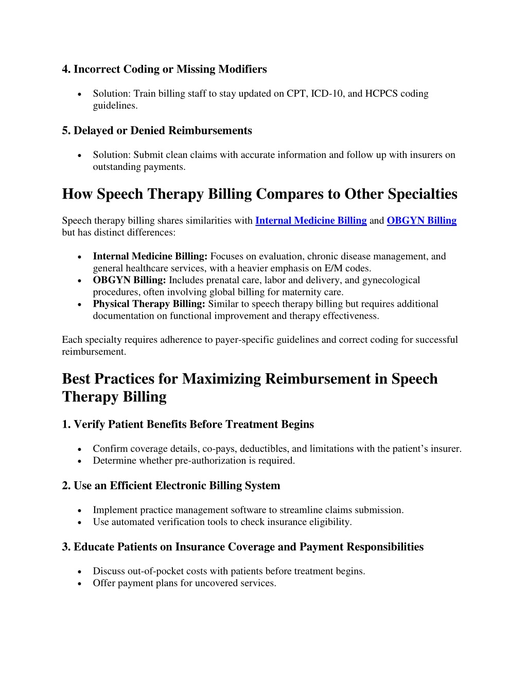 4. Incorrect Coding or Missing Modifiers Solution: Train billing staff to stay updated on CPT, ICD-10, and HCPCS coding guidelines. 5. Delayed or Denied Reimbursements Solution: Submit clean claims with accurate information and follow up with insurers on outstanding payments. How Speech Therapy Billing Compares to Other Specialties Speech therapy billing shares similarities with Internal Medicine Billing and OBGYN Billing but has distinct differences: Internal Medicine Billing: Focuses on evaluation, chronic disease management, and general healthcare services, with a heavier emphasis on E/M codes. OBGYN Billing: Includes prenatal care, labor and delivery, and gynecological procedures, often involving global billing for maternity care. Physical Therapy Billing: Similar to speech therapy billing but requires additional documentation on functional improvement and therapy effectiveness. Each specialty requires adherence to payer-specific guidelines and correct coding for successful reimbursement. Best Practices for Maximizing Reimbursement in Speech Therapy Billing 1. Verify Patient Benefits Before Treatment Begins Confirm coverage details, co-pays, deductibles, and limitations with the patient’s insurer. Determine whether pre-authorization is required. 2. Use an Efficient Electronic Billing System Implement practice management software to streamline claims submission. Use automated verification tools to check insurance eligibility. 3. Educate Patients on Insurance Coverage and Payment Responsibilities Discuss out-of-pocket costs with patients before treatment begins. Offer payment plans for uncovered services.