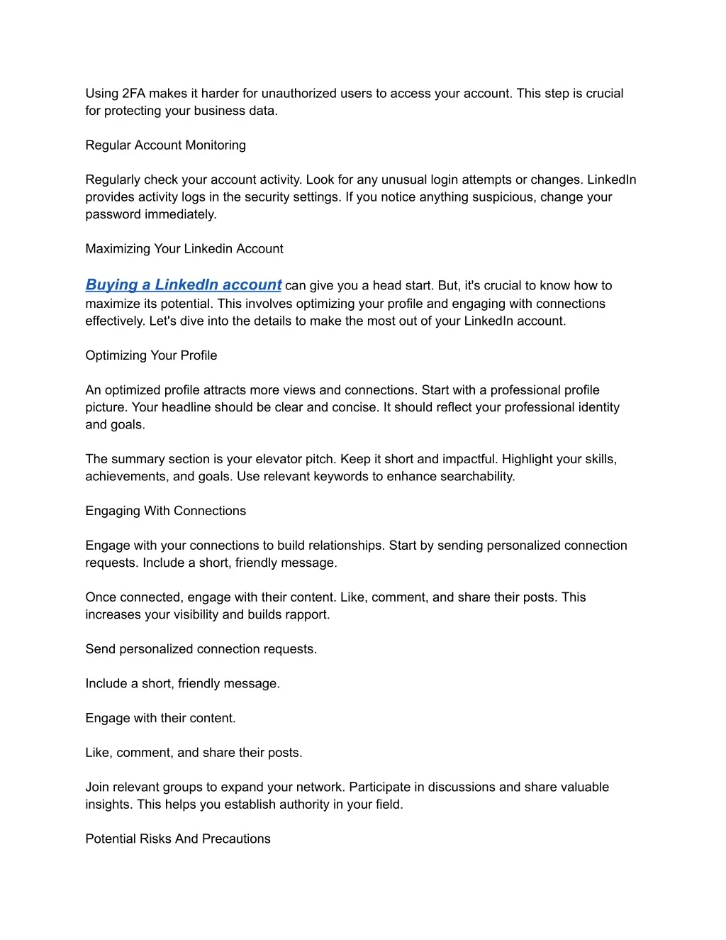 Using 2FA makes it harder for unauthorized users to access your account. This step is crucial for protecting your business data. Regular Account Monitoring Regularly check your account activity. Look for any unusual login attempts or changes. LinkedIn provides activity logs in the security settings. If you notice anything suspicious, change your password immediately. Maximizing Your Linkedin Account Buying a LinkedIn account can give you a head start. But, it's crucial to know how to maximize its potential. This involves optimizing your profile and engaging with connections effectively. Let's dive into the details to make the most out of your LinkedIn account. Optimizing Your Profile An optimized profile attracts more views and connections. Start with a professional profile picture. Your headline should be clear and concise. It should reflect your professional identity and goals. The summary section is your elevator pitch. Keep it short and impactful. Highlight your skills, achievements, and goals. Use relevant keywords to enhance searchability. Engaging With Connections Engage with your connections to build relationships. Start by sending personalized connection requests. Include a short, friendly message. Once connected, engage with their content. Like, comment, and share their posts. This increases your visibility and builds rapport. Send personalized connection requests. Include a short, friendly message. Engage with their content. Like, comment, and share their posts. Join relevant groups to expand your network. Participate in discussions and share valuable insights. This helps you establish authority in your field. Potential Risks And Precautions