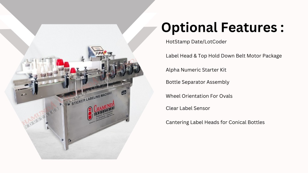 Optional Features : HotStamp Date/LotCoder Label Head & Top Hold Down Belt Motor Package Alpha Numeric Starter Kit Bottle Separator Assembly Wheel Orientation For Ovals Clear Label Sensor Cantering Label Heads for Conical Bottles